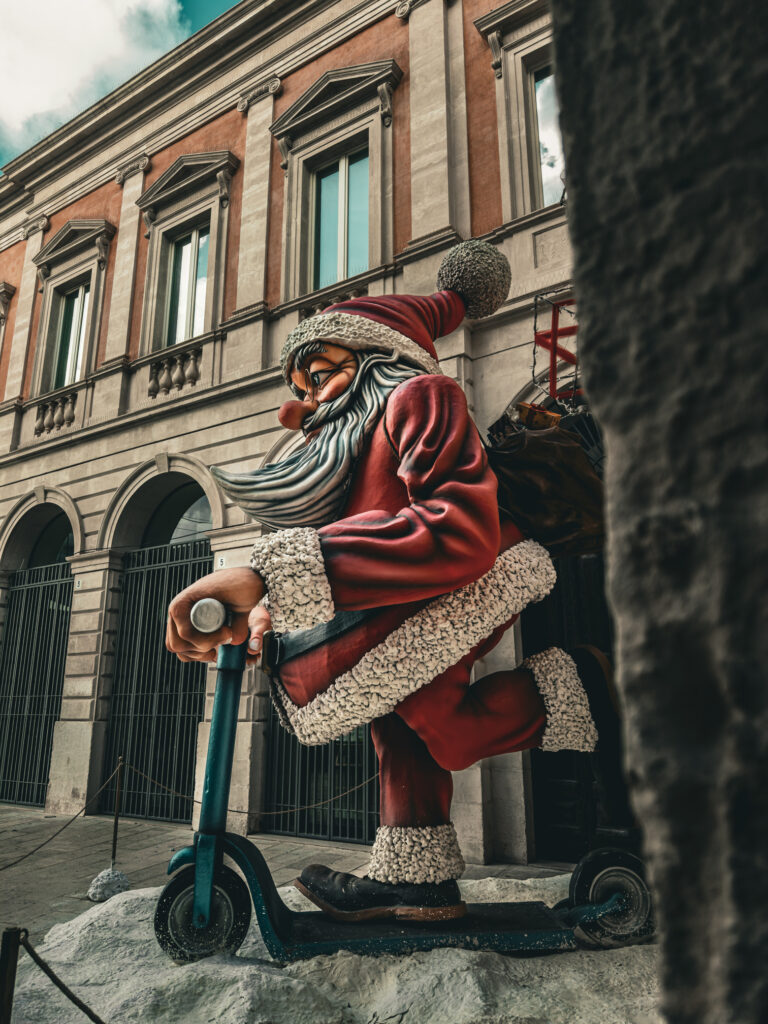 Spicca il Babbo Natale in monopattino alto oltre 5 metri
