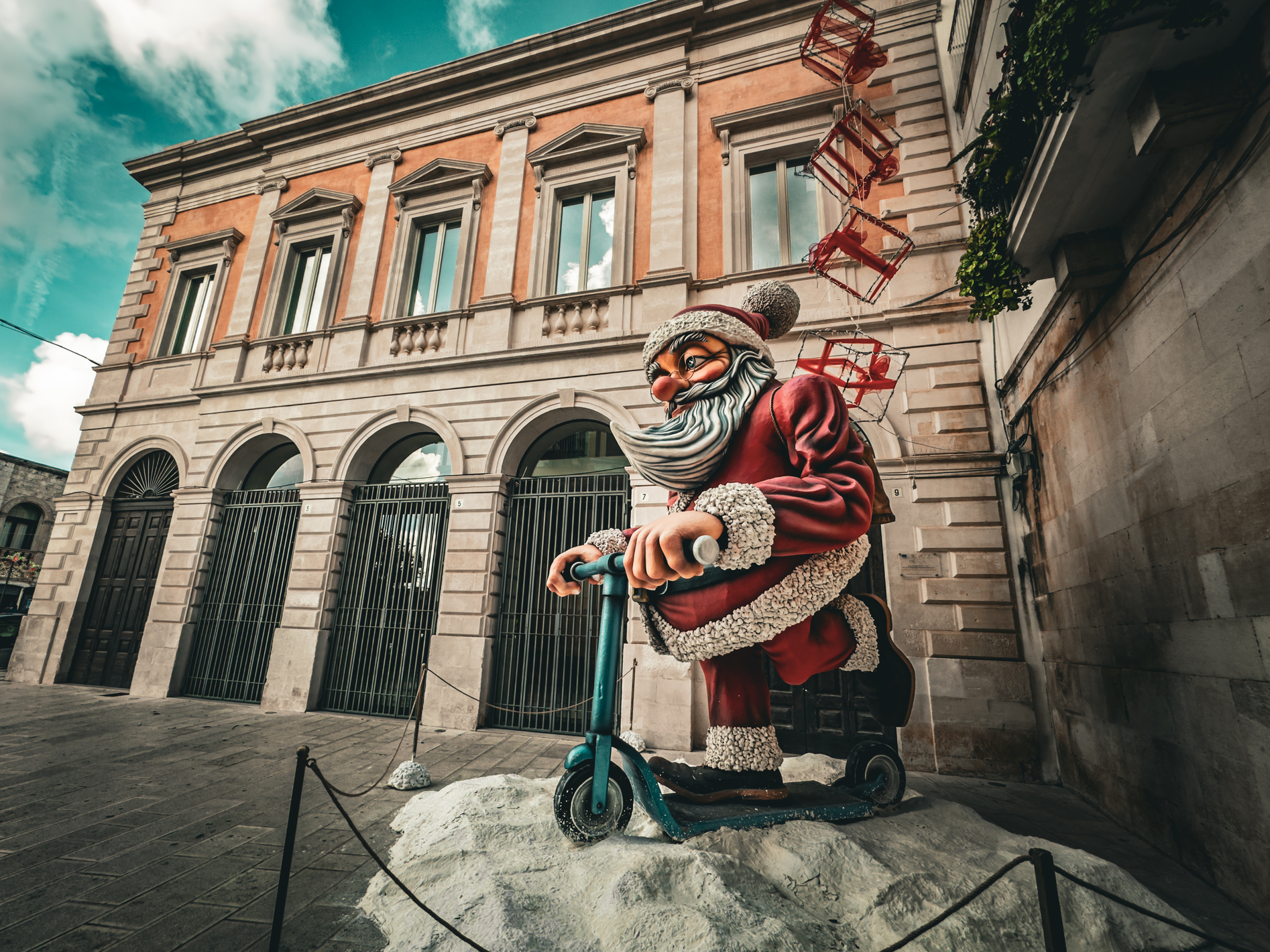 La Fondazione Carnevale di Putignano, in sinergia con il Comune e in particolare con l’assessorato alla cultura, partecipa al cartellone istituzionale “Per le strade del Natale” con degli allestimenti in cartapesta a tema natalizio. C’è il Babbo Natale in monopattino alto oltre 5 metri, donato dall’Associazione Lavori dal Basso alla Fondazione Carnevale, posizionato a Porta Grande, uno dei principali accessi al caratteristico borgo antico. E non è finita qui. Due soldatini in cartapesta, messi a disposizione da Lumen, sono a guardia di Porta Nuova e Porta Barsento per dare il benvenuto ai visitatori. Inoltre, attraversando Putignano è possibile incontrare dei piccoli Babbi Natale in cartapesta; si trovano nel quartiere periferico di San Pietro Piturno, in via Roma accanto al palazzo municipale, e nel centro storico fra via Maggese e piazza Plebiscito.