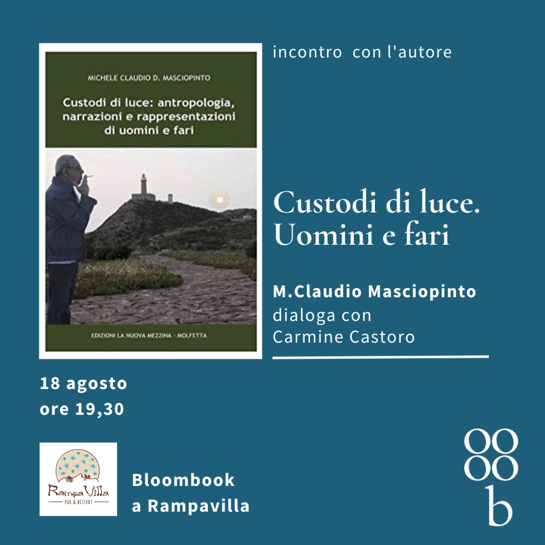 Venerdì 18 Agosto a Conversano alle ore 19.30,sara’presentato il libro “Custodi Di Luce, Uomini e Fari”, prevista presso Rampavilla; ultimo appuntamento della rassegna estiva “Puglia in Controluce” organizzata dalla libreria Bloombook e Rampavilla.