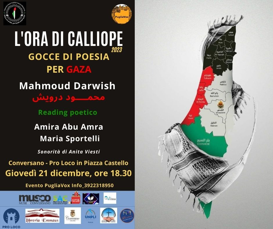 CONVERSANO (BARI) – L’ORA DI CALLIOPE, GOCCE DI POESIA PER GAZA. Intervista ad Amira Abu Amra referente della Comunità Palestinese di Puglia e Basilicata (Giovedì 21 dicembre, ore 18.30) in Pro Loco occasione del reading poetico dedicato a Mahmoud Darwish (13 marzo 1941 – Houston, 9 agosto 2008), poeta e scrittore palestinese che ha combattuto la sua intifada attraverso la parola poetica. È stato giornalista e direttore della rivista letteraria “al-Karmel” (Il Carmelo) e dal 1994 era membro del Parlamento dell’Autorità Nazionale Palestinese. I suoi libri sono stati tradotti in più di venti lingue e diffusi in tutto il mondo. Solo una minima parte della sua produzione letteraria è stata tradotta in italiano. Ha letto in arabo le poesie del poeta con la moderazione della giornalista Maria Sportelli.