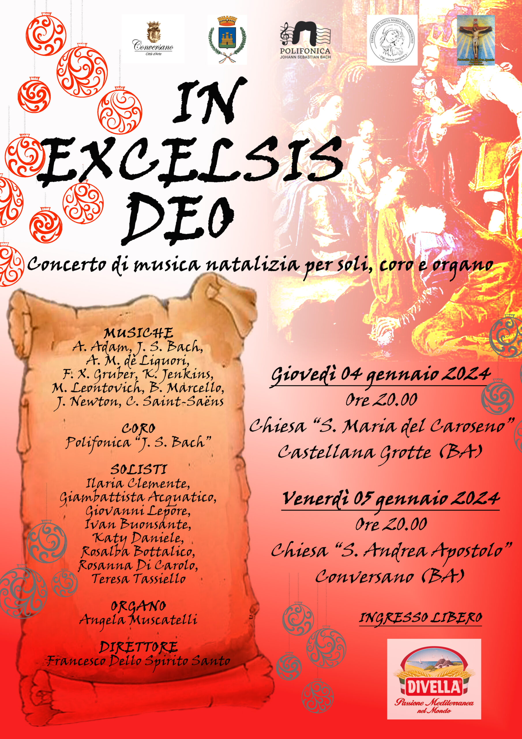 Giovedì 04 Gennaio 2024,alle ore 20.00, presso la parrocchia “Maria SS. del Caroseno” in Castellana Grotte (BA) e venerdì 05 gennaio 2024, alle ore 20.00, presso la parrocchia “Sant’Andrea Apostolo” in Conversano (BA) si terrà l’evento musicale “IN EXCELSIS DEO”, concerto di musica natalizia per soli, coro e organo. Il concerto, patrocinato dai ComunidiCastellana Grotte e Conversano,è organizzatodalla corale polifonica “J. S. Bach” di Conversano (BA), realtà composta da composta da venti coristiche si esibirannoin un repertorio di musica nataliziache spazieràattraverso i secoli fino a toccare la musica contemporanea. Nella serata si potranno ascoltare le voci soliste di Ilaria Clemente, Giambattista Acquatico, Giovanni Lepore, IvanBuonsante, Katy Daniele, Rosalba Bottalico, Rosanna Di Carolo e Teresa Tassiello. La direzione sarà invece di Francesco Dello Spirito Santoche da tempo sioccupa di attività musicali suiterritoripugliese e piemontese. L’accesso al concerto saràlibero e gratuito e tutti sono invitati a prendervi parte.