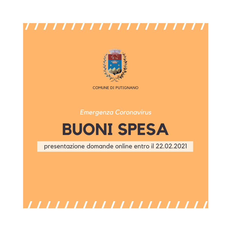 Il Comune di Putignano ha riaperto i termini per richiedere i buoni spesa Covid. È possibile presentare domanda fino al 22 febbraio 2021 esclusivamente online, attraverso la piattaforma https://serviziadomanda.resettami.it/putignano/. Non saranno ammesse domande cartacee.