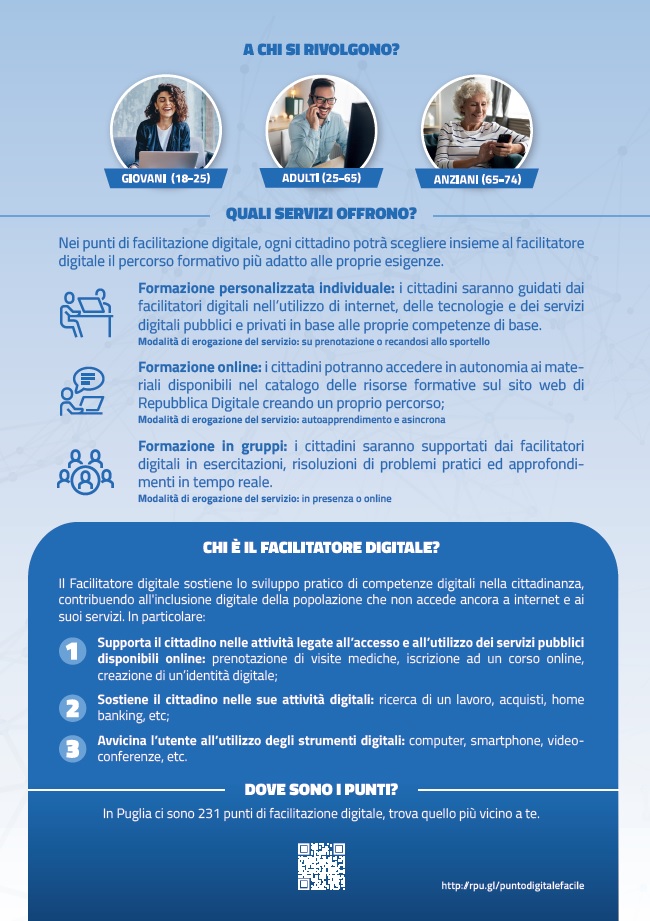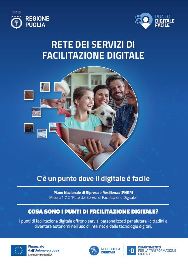 Anche Rutigliano, in qualità di comune facente parte l’Ambito Territoriale Sociale di Mola di Bari, si è dotato di un punto di facilitazione digitale, attivo presso Palazzo San Domenico (in via Leopoldo Tarantini) tutti i giovedì e venerdì dalle ore 9.00 alle ore 13.00. Ogni cittadino di età compresa tra i 18 e i 74 anni, accedendo al servizio, avrà a disposizione una serie di strumenti per rendere più autonomo e consapevole il proprio utilizzo di Internet e delle tecnologie digitali, dei principali servizi digitali pubblici online e dei principali servizi digitali privati.