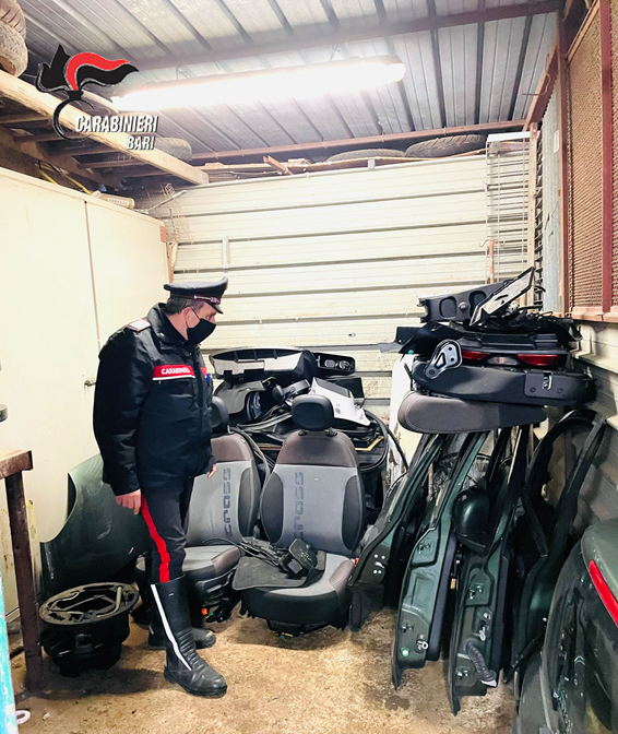 Quando si è riusciti a localizzare con esattezza il segnale, si è deciso di intervenire dentro il capannone. Ma con sorpresa degli operanti, all’interno della struttura non c’era solo l’auto. Infatti, sono state trovate altre tre autovetture oggetto di furto – una completamente smontata e le altre due in fase di smontaggio – un furgone rubato carico di materiale di ricambio nonché svariati pezzi di veicoli, tra sportelli, sedili, specchietti retrovisori già accatastati e pronti per essere rivenduti o rimontati su altre auto.
