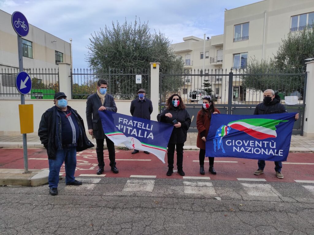 Si è svolto domenica mattina 5 dicembre alle ore 11.00 un Flash mob organizzato dai dirigenti locali di Fratelli d’Italia e Gioventù Nazionale. A nome degli iscritti, simpatizzanti e cittadini che ci hanno contattato e di cui ci facciamo portavoce, la coordinatrice cittadina Silvia Serena Perrone ha tenuto a ricordare che.“Gli anziani residenti nella struttura sono per ciascuno di noi genitori, nonni e zii. Sono la generazione di coloro che con il proprio lavoro hanno contribuito alla crescita della nostra città e a renderla molto bella. Oggi noi siamo qui per un dovere morale nei loro confronti; ora che hanno ancor più bisogno, in quanto persone fragile e più a rischio pandemia , per dire  loro, alle loro famiglie e agli operatori che non li lasceremo soli ad affrontare quella che è l’emergenza sanitaria più grave per la nostra Nazione dal dopoguerra ai giorni nostri.  Ringraziamo i quadri di partito che a vario titolo ci stanno supportando ed in particolar modo il dott. Zullo per la sua presenza, qui  a Conversano con noi questa mattina,  presso la struttura di residenza per anziani.”  Il Centro Polifunzionale “Il Vivere Insieme” necessita con urgenza di intervento da parte delle Istituzioni. A causa del contagio da Covid-19 sono rimasti solo 3 oss negativi i quali da soli stanno garantendo per quello che possono, l’assistenza sociosanitaria. E’ fondamentale che Regione ed Asl prendano in mano la situazione gestendo in via straordinaria la struttura come fosse un ospedale covid, ciò in quanto degli attuali 58 ospiti ben 56 sono risultati positivi al tampone molecolare. E’ indispensabile la presenza di medici, infermieri e oss in modo costante così che si possa garantire lì assistenza socio-sanitaria, ricordando che il diritto alla salute è tutelato dalla nostra Costituzione. Su questa situazione è intervenuto il Capogruppo di Fratelli d’ Italia in Regione, dott. Ignazio Zullo sollecitato dal Circolo Cittadino di Fdi e da Gioventù Nazionale  di Conversano:”La mia presenza qui è per sensibilizzare le Istituzioni che si occupano di Sanità, affinché, prendano in carico questa situazione. Una situazione che è esplosiva per quello che è la numerosità dei contagi sia gli ospiti che per gli operatori, ospiti, ormai, lasciati abbandonati e senza assistenza. E io mi auguro che questa dimostrazione di presenza possa dare la coscienza e la sensibilità del Direttore Generale della Asl, del Presidente Emiliano, dell’Assessore alla Sanità, Lopalco e che prontamente di prendano carico di questa situazione.”
