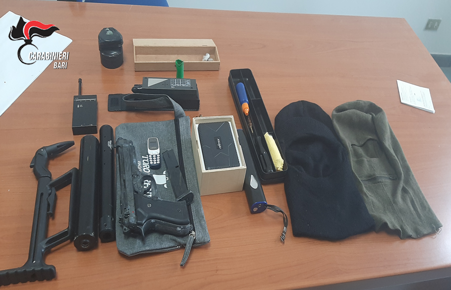 E’ stato invece deferito a piede libero, per detenzione abusiva di armi, un 42enne di Conversano, commerciante. I Carabinieri del luogo, infatti, durante la perquisizione domiciliare hanno rinvenuto, all’interno di un locale adibito a lavanderia, due silenziatori per armi comuni da sparo, una cartuccia per fucile cal. 12, due passamontagna e vari dispositivi elettronici fra i quali un rilevatore di gps, un gps artigianale e un teaser elettrico privo di marca. Inoltre, occultate nella cabina del contatore elettrico, sono state rinvenute una pistola giocattolo, simile a quelle in uso alle forze di polizia, senza tappo rosso, insieme a 40 cartucce a salve.