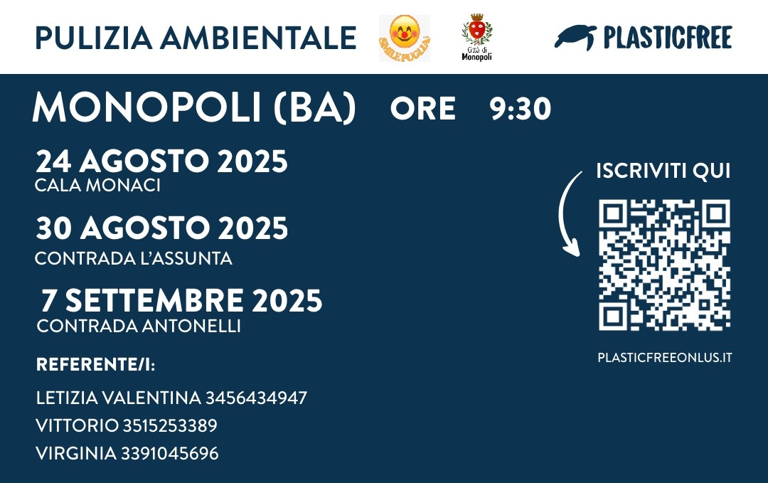 Il Comune di Monopoli, attraverso l’Assessorato all’Ambiente, promuove tre giornate di pulizia ambientale realizzate in collaborazione con l’associazione Plastic Free Onlus e con il supporto di Smile Puglia, con l’obiettivo di sensibilizzare la cittadinanza sull’importanza della tutela del territorio e sulla necessità di contrastare l’abbandono dei rifiuti.