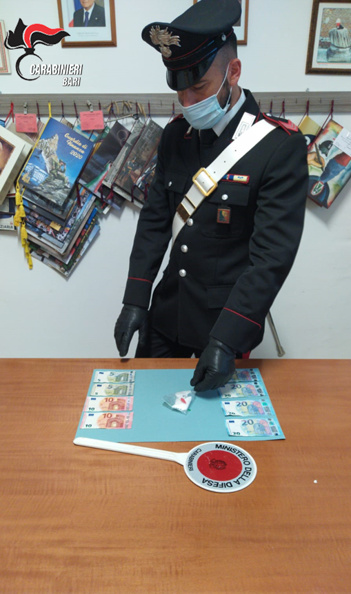La perquisizione personale ha dato immediati riscontri, permettendo di trovare un involucro contenente gr. 5 di cocaina, nascosta nei pantaloni, nonché 100 euro in banconote di vario taglio, ritenuti proventi di attività di spaccio.