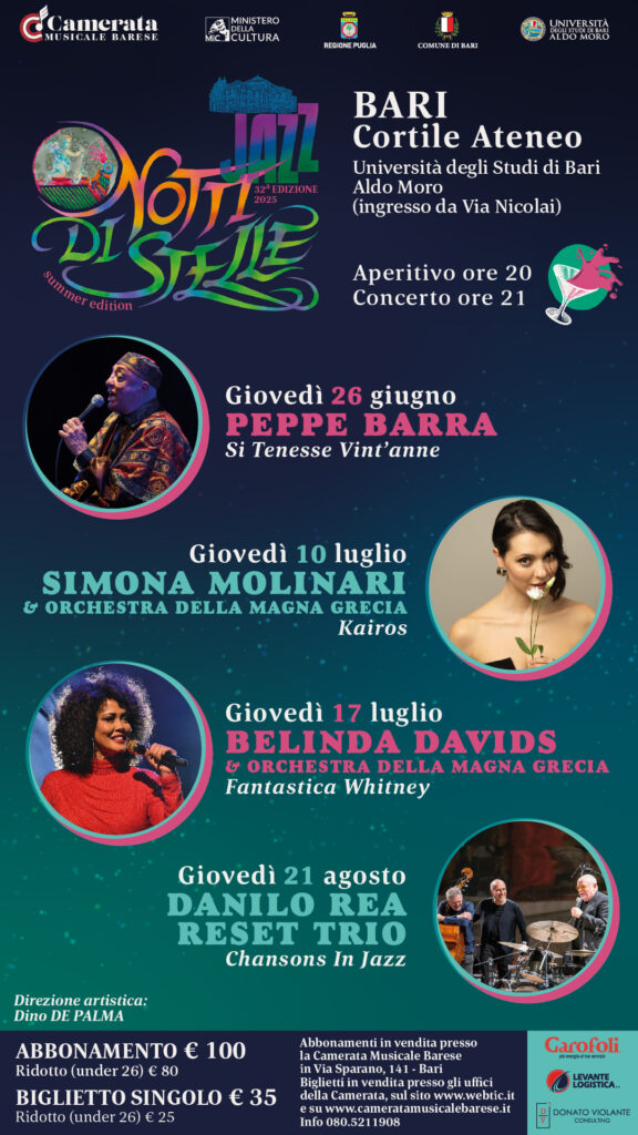 Quattro serate, quattro universi sonori, quattro modi diversi di abitare il palco, tra teatro e canzone, jazz e soul, pop sinfonico e pop d’autore. In un’estate che ha il sapore della cultura verace, le “Notti di Stelle” tornano a Bari per regalarci il lato più nobile, leggero e profondo della musica dal vivo. La Camerata Musicale Barese, con la direzione artistica del M° Dino De Palma, porta in scena per la 32ª edizione della storica rassegna nel Cortile dell’Ateneo barese (ingresso di via Nicolai) “la grande bellezza” della musica tra apprezzati interpreti della scena italiana e internazionale, atmosfere intime e coinvolgenti, aperitivi da gustare insieme e un luogo all’aperto che invita a godere del centro cittadino. A fare da preludio a ogni appuntamento, ci sarà come di consueto l’aperitivo “Spritz-ziamo musica”, dalle 20.00 alle 20.40, un momento conviviale e disinvolto per brindare insieme all’arte prima che le luci si abbassino e lo spettacolo abbia inizio. Ad aprire la rassegna, giovedì 26 giugno alle ore 21, un “monumento” della scena partenopea: Peppe Barra, cantore e attore, voce e corpo di una Napoli eterna. Il suo spettacolo “Si tenesse vint’anne” è un viaggio teatrale e musicale tra memoria e reinvenzione, un affresco vivente in cui la canzone classica napoletana, i brani originali e le reinterpretazioni d’autore si traducono in una narrazione potente e commossa. La voce inconfondibile di Barra sarà accompagnata da un ensemble di straordinari musicisti – Del Vecchio, Urciuolo, Lacagnina, Pelosi e Di Cristofaro – per questo rituale contemporaneo, intenso e necessario. Giovedì 10 luglio ore 21, il secondo atteso appuntamento “Kairos” vedrà la cantautrice jazz-pop Simona Molinari entrare in una dimensione sospesa, dove ogni brano sarà un attimo perfetto. Insieme all’Orchestra della Magna Grecia diretta da Piero Romano, la voce di Molinari – elegante, brillante, profondamente espressiva – attraverserà standard jazz, perle del songbook internazionale e brani originali con uno stile sofisticato e leggero. In programma, capolavori firmati Ella Fitzgerald, Irving Berlin, Amy Winehouse, accanto a pagine del suo repertorio. Accanto a lei, Egidio Marchitelli alla chitarra e Claudio Filippini al pianoforte. Giovedì 17 luglio ore 21, Belinda Davids, autentico fenomeno vocale sudafricano, porterà a Bari il suo omaggio alla regina del pop-soul Whitney Houston. Un concerto potente, sincero, emozionante, quello di “Fantastica Whitney” impreziosito dagli arrangiamenti orchestrali del Maestro Roberto Molinelli, che dirigerà l’Orchestra della Magna Grecia. “I Will Always Love You”, “Run to You”, “I Wanna Dance with Somebody”, solo alcuni dei brani che metteranno in connessione pubblico e artista per questo omaggio autentico che saprà far sognare e commuovere. A chiudere la rassegna, l’arte funambolica dell’improvvisazione con il Reset Trio: Danilo Rea al pianoforte, Massimo Moriconi al contrabbasso e Ellade Bandini alla batteria. Tre leggende del jazz italiano, unite da un’intesa rara, celebrano le grandi canzoni d’autore italiane – da Mina a De André, da Battisti a Modugno – e standard internazionali (Radiohead, Coldplay, Petrucciani), in una continua reinvenzione sonora. Un finale perfetto per un’estate in musica.