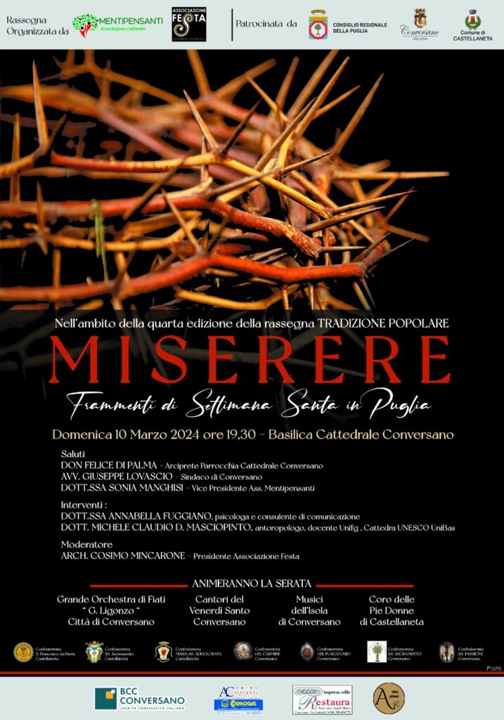 partecipazione popolare. La nostra volontà è quella di portare avanti questo progetto di tutela e valorizzazione, poiché fortemente convinti dell’importanza della valorizzazione del folklore e delle tradizioni locali. L’evento, attraverso il racconto di esperti, ripropone un percorso, rispettoso e coinvolgente, tra i suoni e le immagini della Settimana Santa così come vengono vissuti nei diversi centri della nostra regione. Le precedenti edizioni hanno visto la partecipazione di Gallipoli, Taranto, Noicattaro e Bitonto, eccellenti narratori dei riti che ogni anno, puntualmente e da secoli si svolgono nelle proprie città. Con l’edizione dello scorso anno, si è deciso di raddoppiare l’evento riproponendolo in due comunità protagoniste, una delle quali Conversano, città “capofila” del progetto. In questa edizione la seconda realtà protagonista sarà Castellaneta (TA), tra le città più rappresentative in tema di tradizioni legate alla Settimana Santa.