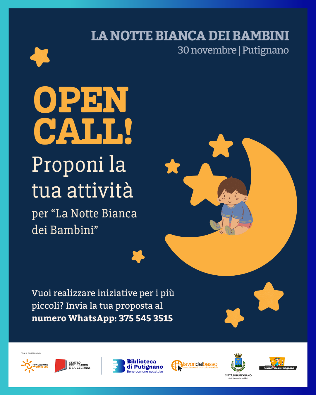 La Notte Bianca dei Bambini è un’azione del progetto “La Biblioteca come primo Bene Comune Collettivo”, progetto sostenuto dalla Fondazione CON IL SUD e dal Centro per il libro e la lettura, che nasce per valorizzazione la Biblioteca Comunale di Putignano attraverso attività di promozione della lettura e di partecipazione culturale.