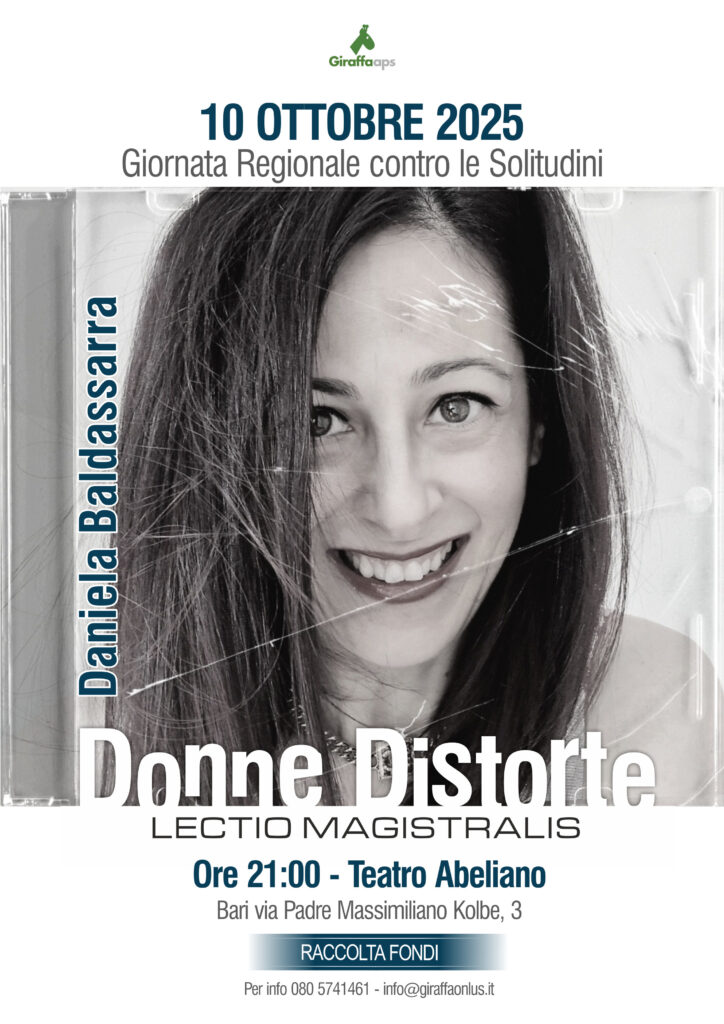 Per celebrare la XIV Giornata contro le Solitudini, venerdì 10 ottobre alle 21.00, nel Teatro Abeliano di Bari, ci sarà la prima nazionale della Lectio Magistralis “Donne Distorte” a cura dell’attivista Daniela Baldassarra. Si tratta di un ampio excursus storico, politico, sociale tracciato intorno alla vita pubblica e privata di tre donne diversissime tra loro, e di epoche lontanissime tra loro. È la prima Lectio Magistralis di Daniela Baldassarra che “rilegge” e ribalta la nostra ancestrale visione del potere femminile e della libertà delle donne. In un viaggio tra passato e presente, senza troppo tradire la sua cifra stilistica sarcastica e provocatoria, l’autrice guida il pubblico lontano da tutti quei luoghi comuni che ancora oggi penalizzano l’affermazione di un femminile libero sia in ambito sociale che lavorativo.