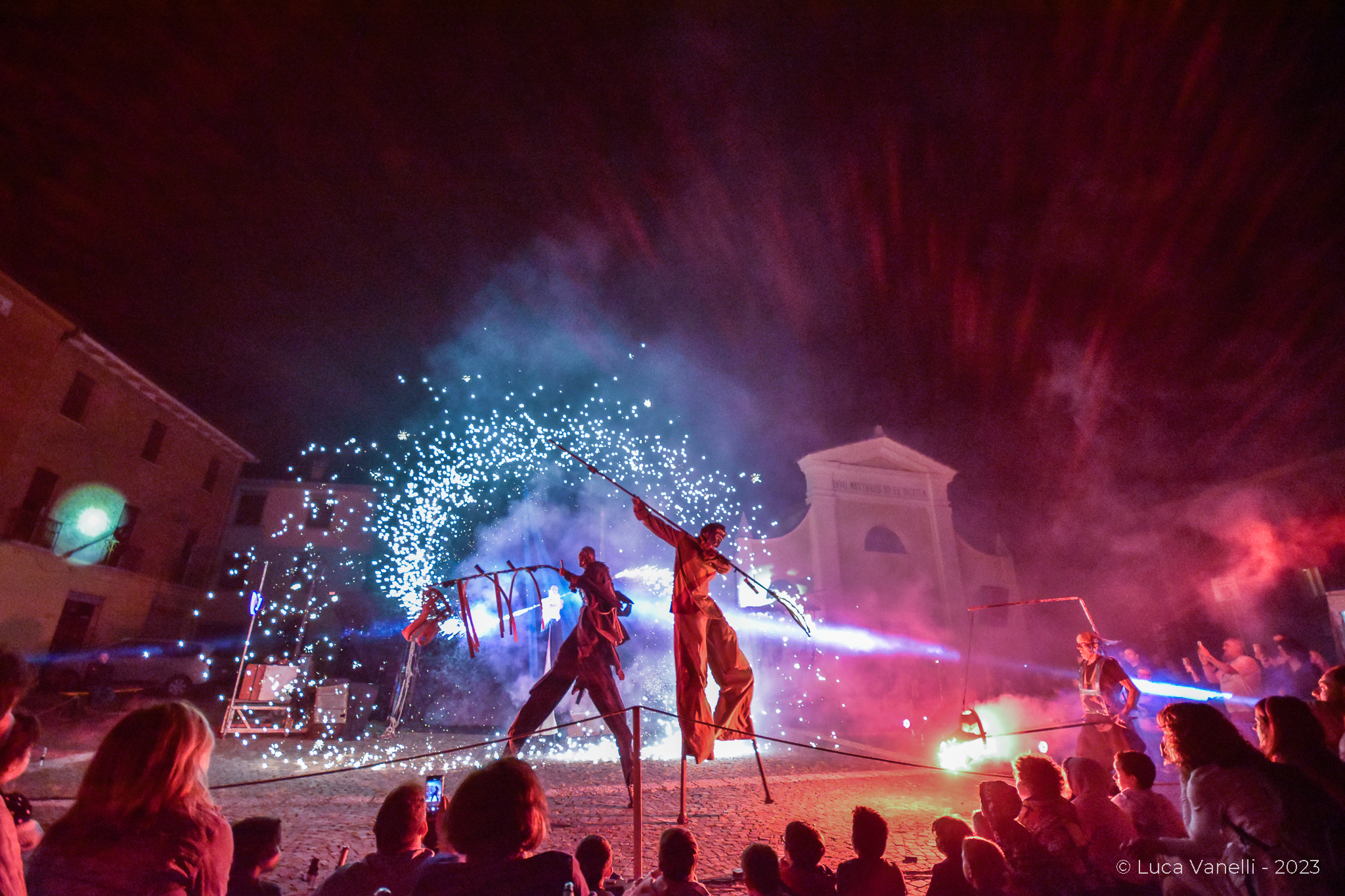 Lo spettacolo di piazza “The Tempest”, messo in scena dalla compagnia teatrale Accademia Creativa è un grande spettacolo che utilizza trampoli, fuoco, effetti di luce, danza aerea. Uno spettacolo liberamente tratto dall’opera di Shakespeare dove le discipline del teatro e del cirque nouveau si fondono per dare vita ad uno spettacolo unico nel suo genere. Dalla danza aerea all’acrobatica su trampolo passando per la commedia dell’arte con importanti maschere in cuoio realizzate artigianalmente e decorate con maestria; il tutto arricchito da imponenti copricapi, elaborati costumi, l’utilizzo di strumenti visual e musiche imponenti attentamente selezionate per emozionare e coinvolgere il pubblico dall’inizio alla fine.