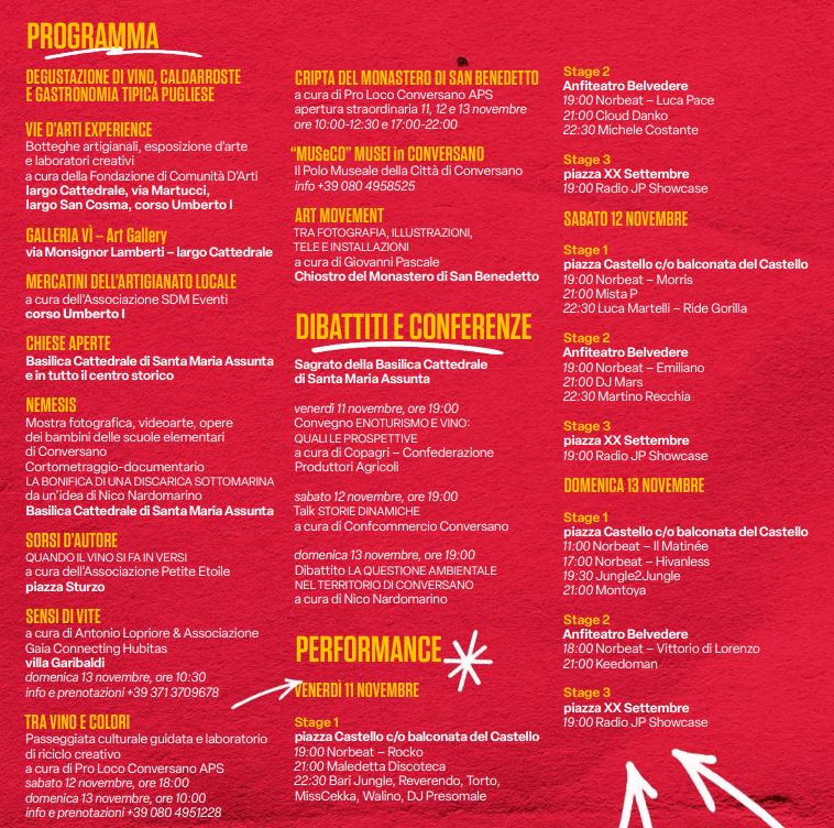 Conversano (Bari) – Novello sotto il Castello with Fruttattiva. Senti come suona… Perché nulla sarà più come prima! 11, 12, 13 novembre a Conversano diventa protagonista di un’esperienza musicale e gustativa straordinaria. Tre giorni ricchi di appuntamenti con grande novità: una line-up di musica elettronica tra Guest Internazionali e DJs, la “Castagna segreta” di Fruttattiva, le migliori Cantine del territorio, le delizie della miglior enogastronomia pugliese e la nuovissima area food truck. L’evento è organizzato da La Compagnia del Trullo, presidente Antonio Innamorato, che abbiamo intervistato a margine della conferenza stampa. Direzione artistica Norbeat con i patrocini di Comune di Conversano, Regione Puglia, Ministero dell’Agricoltura.