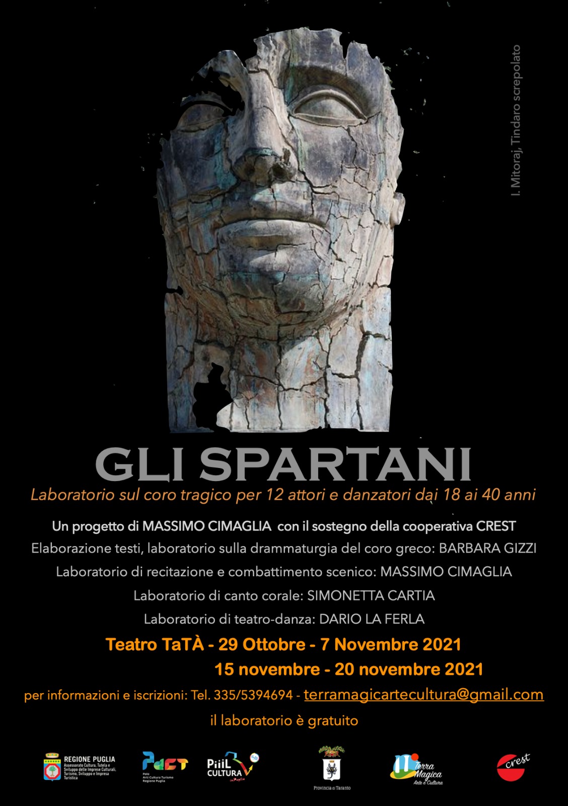 Quattro docenti d’eccezione per trasmettere le fondamenta di un genere tra i più suggestivi, profondi, attuali e attraenti: la tragedia. Recitazione, danza, combattimento scenico, canto corale sono alcune delle materie che verranno insegnate durante il percorso progettato dall’attore e regista Massimo Cimaglia e da Terra Magica Arte e Cultura. Progetto realizzato grazie al sostegno di cooperativa teatrale Crest, Regione Puglia-Assessorato Cultura, Pact (Polo Arti Cultura Turismo Regione Puglia), Piiil Cultura Puglia.