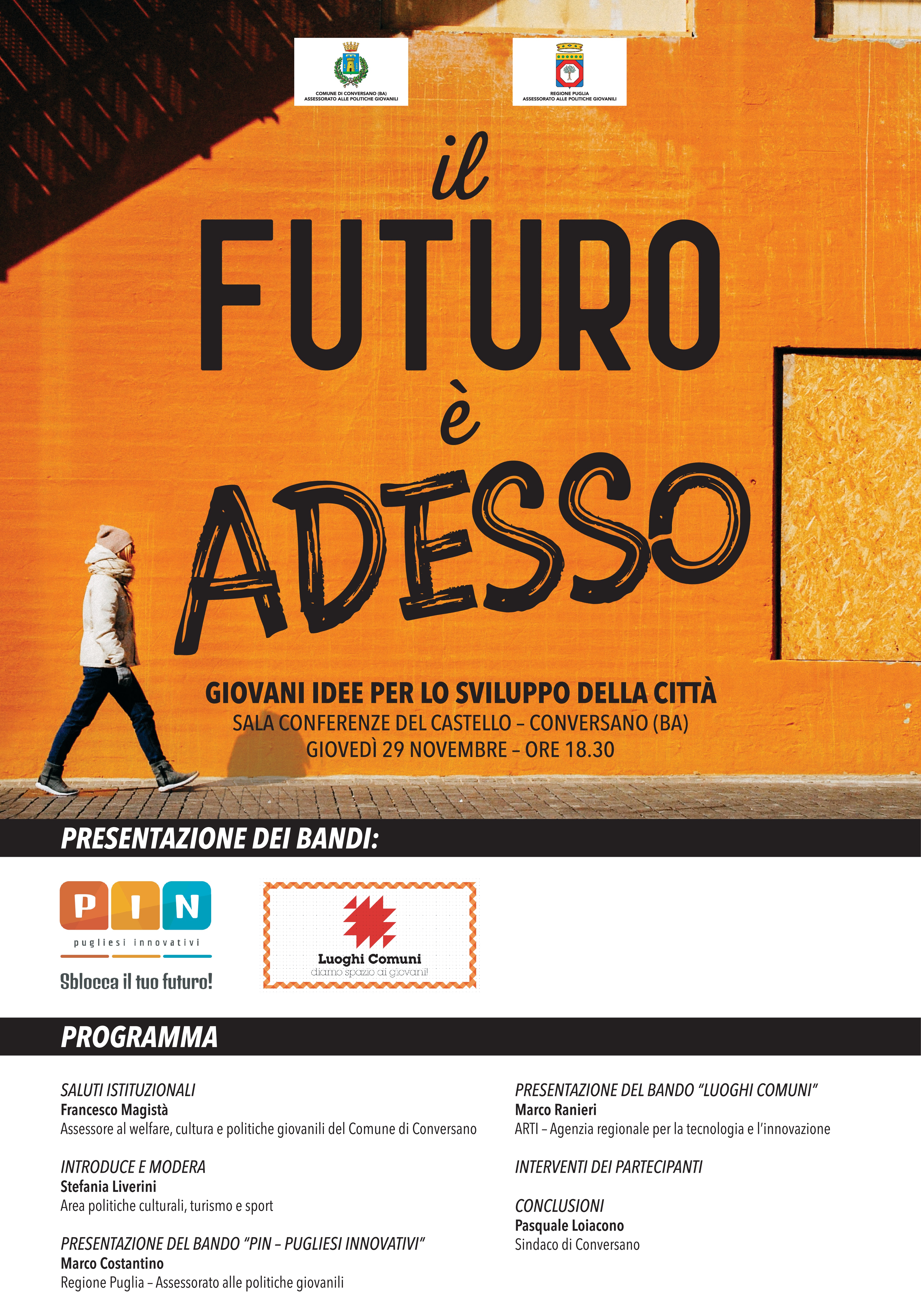 Il programma della serata prevede il saluto dell’Assessore al Welfare, Politiche Giovanili e Cultura del Comune di Conversano, Ciccio Magistà, la presentazione del bando a cura della Agenzia Regionale per la Tecnologia e l’Innovazione, con le conclusioni affidate alSindaco Pasquale Loiacono. Introdurrà e modererà l’incontro la Responsabile dell’Area Politiche Culturali Turismo e Sport, Stefania Liverini.