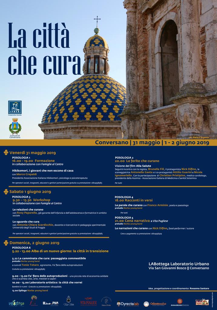 Con “La città che cura” si vuole attraverso, incontri formativi, workshop, visione di film, poesia, narrazioni e passeggiate sottolineare come il prendersi cura di un territorio parta da buone relazioni e da un buon rapporto col territorio,inteso soprattutto come centro di aggregazione sociale. Prendersi cura di sé attraverso atti di bellezza che nutrano il cuore è l’unica possibilità per prendersi cura degli altri e vivere relazioni sane. Franco Arminio direbbe:”Cambiate vita appena possibile. Ogni giorno si può cambiare vita(…) Cambiate vita appena vi è chiaro che la noia uccide un attimo su due”.