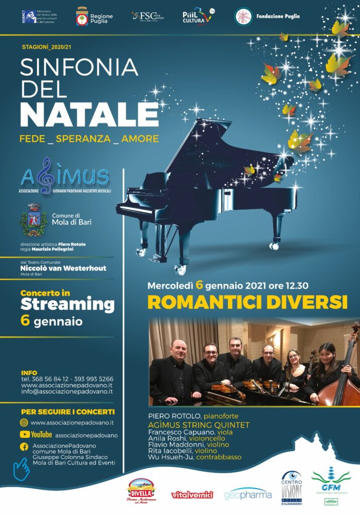 Il trittico di appuntamenti in streaming «Sinfonie del Natale» promosso dall’Agìmus (Associazione Giovanni Padovano Iniziative Musicali) con il Comune di Mola di Bari e la regia di Maurizio Pellegrini si chiude mercoledì 6 gennaio (ore 12.30) con la messa in onda dal Teatro van Westerhout del concerto «Romantici diversi», protagonisti il pianista Piero Rotolo e l’Agìmus String Quintet composto da Flavio Maddonni e Rita Iacobelli ai violini, Francesco Capuano alla viola, Anila Roshi al violoncello e Wu Hsueh-Ju al contrabbasso. Arricchita dalle immagini del Castello Angioino, della Chiesa Matrice, di Palazzo Roberti e del Chiostro di Santa Chiara, la visione è in programma su tutte le piattaforme digitali del Comune di Mola e dell’Agìmus (sito istituzionale, canale YouTube e pagina Facebook).