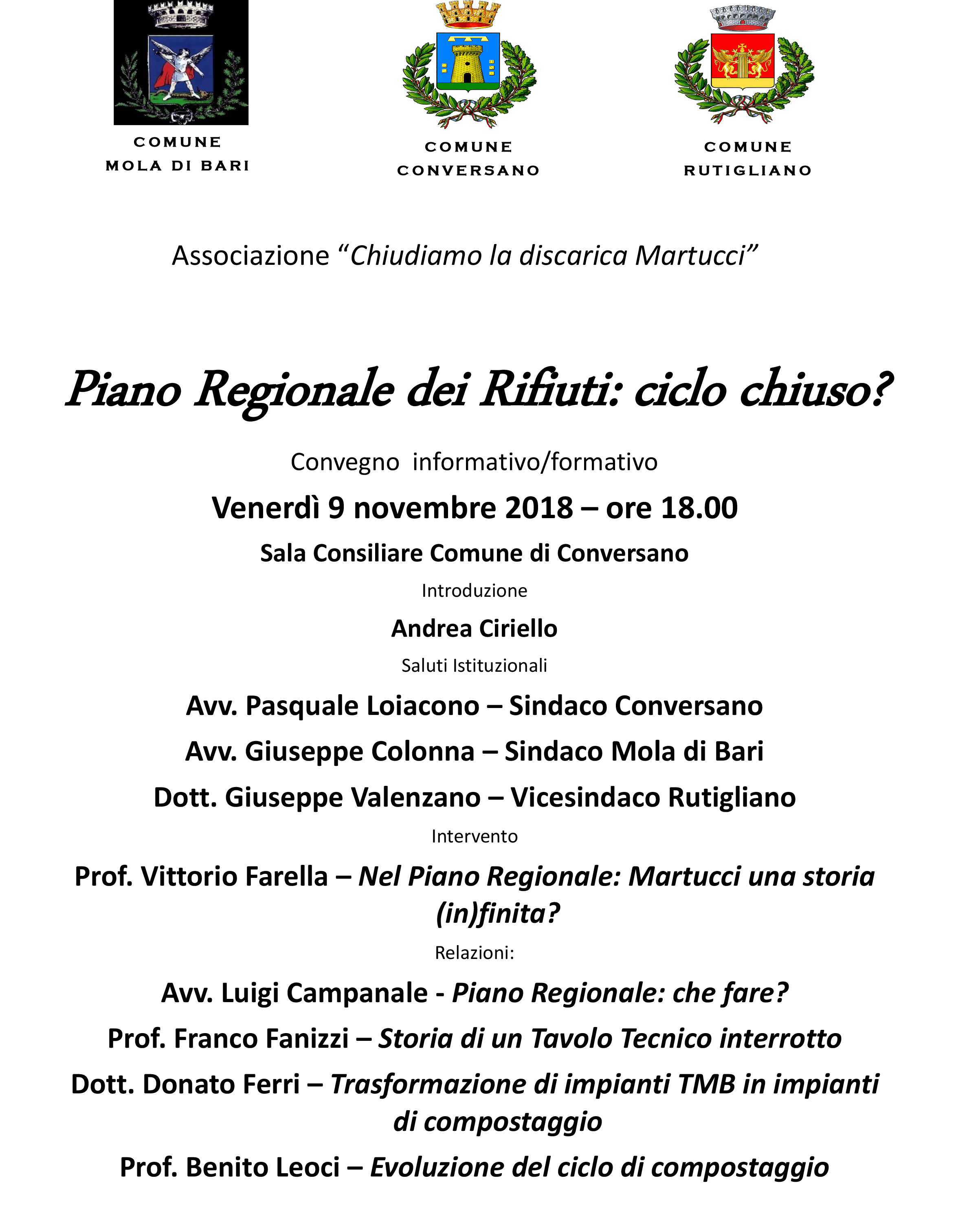 Amministrazioni Comunali di Conversano, Mola e Rutigliano, come da programma che vi alleghiamo. Assieme vi riportiamo allegate alcune note di illustrazione dell’evento. Associazione ” Chiudiamo la discarica Martucci”.