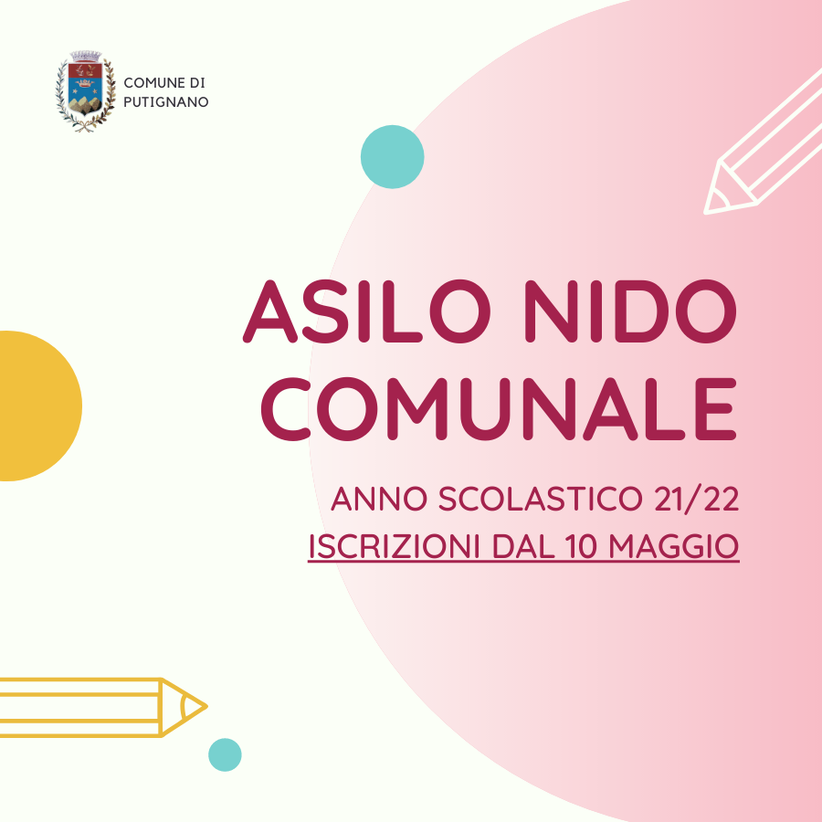 Dal 10 maggio 2021 si aprono le iscrizioni all’Asilo Nido Comunale di Putignano per l’anno educativo 2021-2022. Sul sito web del Comune di Putignano è disponibile l’avviso e la modulistica per l’iscrizione, da compilare e inviare esclusivamente via email entro le ore 14:00 del 15 giugno 2021.
