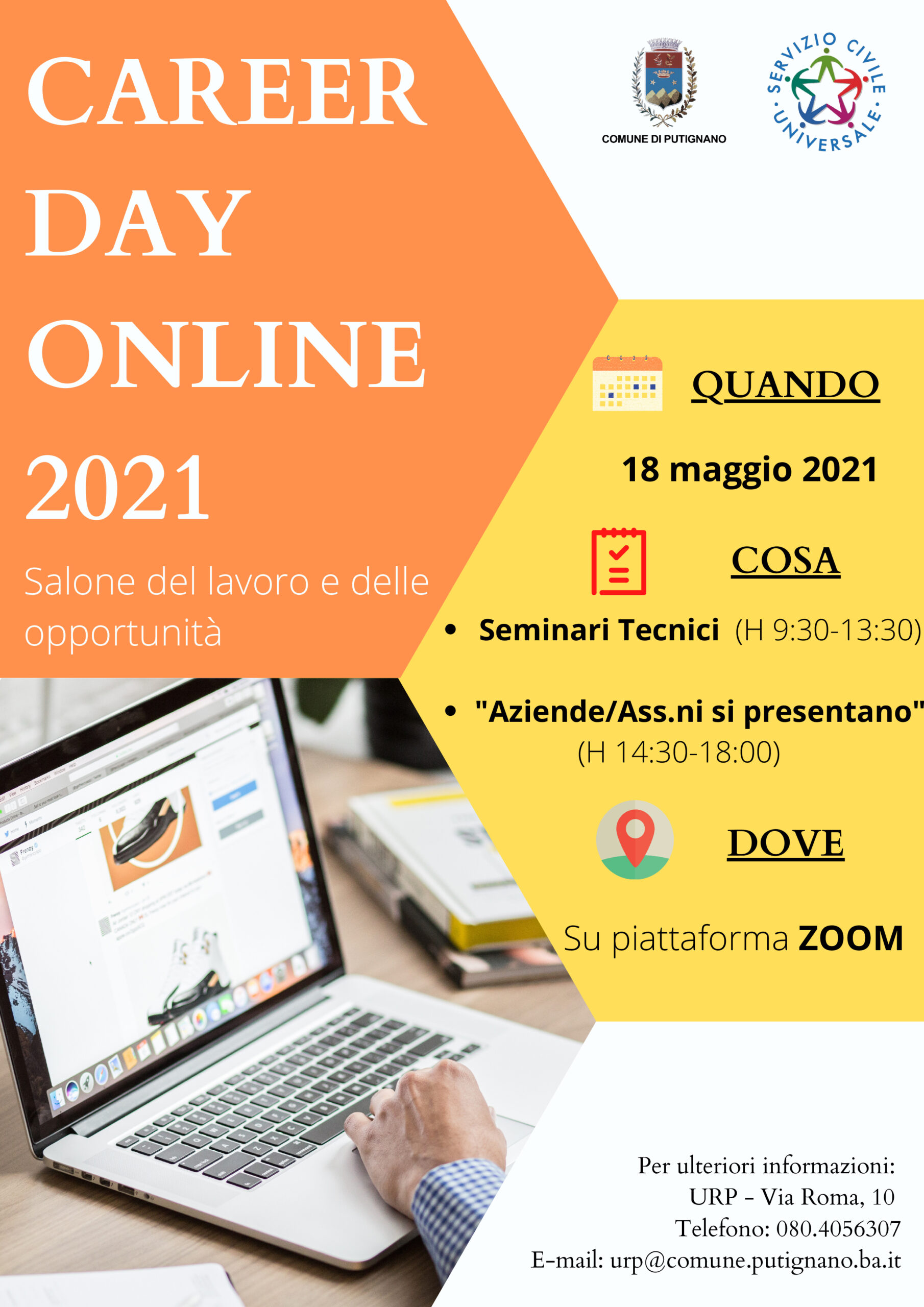 Un’occasione per favorire l’incontro tra aziende e cittadini, per connettere domanda e offerta di lavoro. Si svolgerà il 18 maggio, in modalità online, il Career Day a cura degli operatori del Servizio Civile Universale – Progetto Pianeta Giovani in servizio al Comune di Putignano.