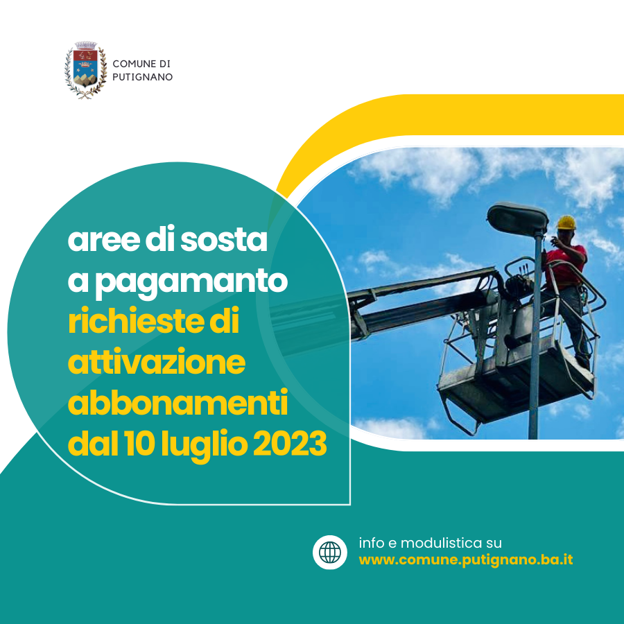 n partenza, a Putignano, la procedura di attivazione degli abbonamenti per l’utilizzo dei parcheggi a pagamento. Da lunedì 10 luglio sarà possibile presentare istanza di richiesta abbonamenti, utilizzando la modulistica disponibile sul sito web del Comune di Putignano, all’Ufficio URP – Relazioni con il Pubblico e al Comando di Polizia Locale, secondo le modalità riportate di seguito.