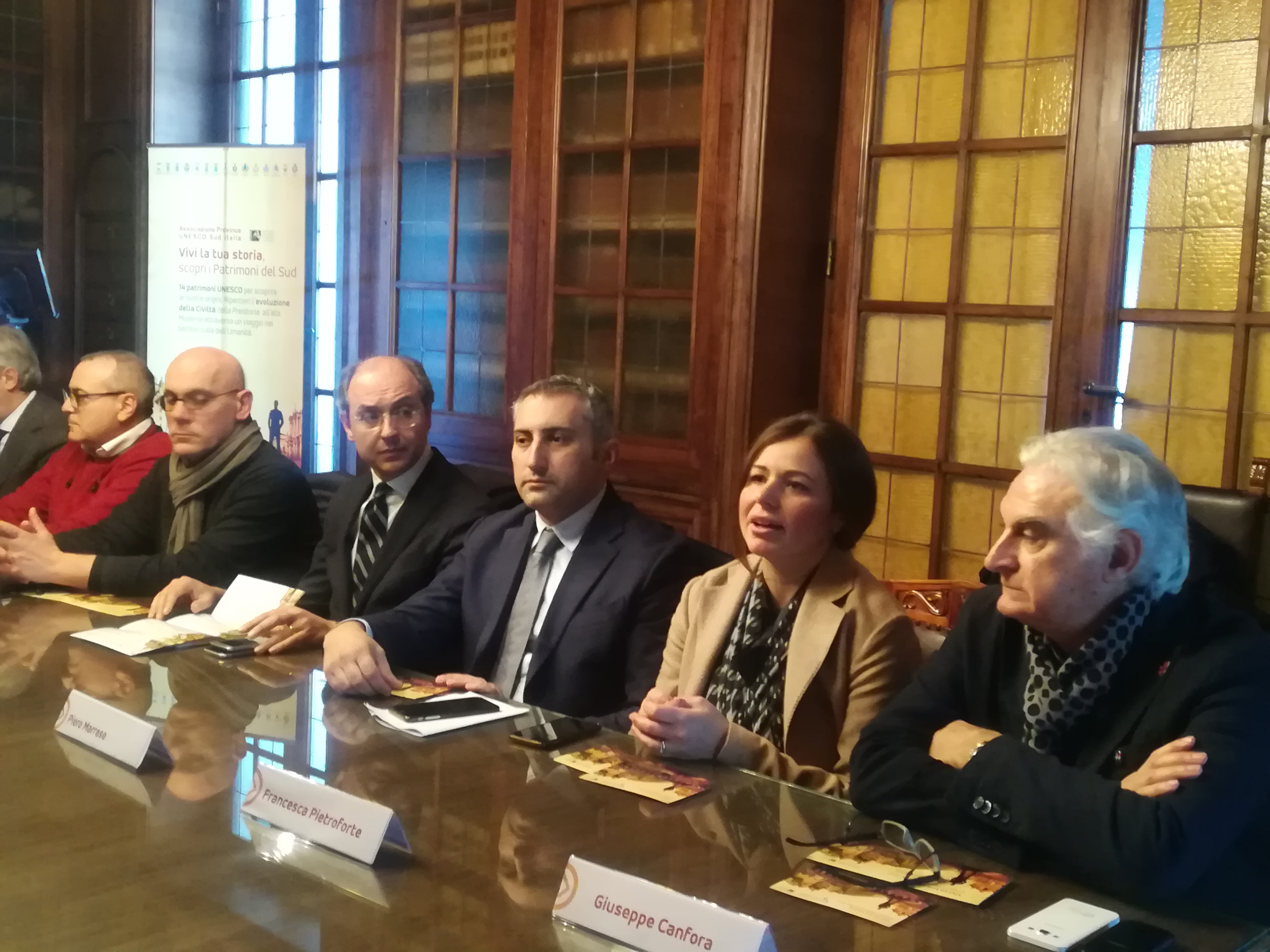 Tutte le novità sono state illustrate in un incontro con la stampa, questa mattina, nella Sala del Consiglio della Città Metropolitana di Bari (Lungomare Nazario Sauro, 29). Hanno partecipato: Giuseppe Canfora, Presidente dell’Associazione Province Unesco Sud Italia, Francesca Pietroforte, Consigliere con delega ai beni culturali della Città Metropolitana di Bari e Vicepresidente dell’Associazione Province Unesco Sud Italia, Piero Marrese, Presidente della Provincia di Matera, Nicola Giorgino, Presidente della Provincia BAT, Ciro Castaldo, Referente Provincia di Salerno del progetto Rete Siti Unesco, Elisabetta Gabrielli, project leader progetto Rete Siti Unesco, Alfonso Marrazzo, Segretario Generale della Provincia di Matera capofila del progetto Rete Siti Unesco, Francesco Paolo Salcuni, Presidente Circolo Legambiente “FestambienteSud”, componente del Cts per l’ambito 3, Filippo Spallina, Responsabile Attività Operative Comunicazione e Disseminazione del Progetto Rete Siti Unesco.