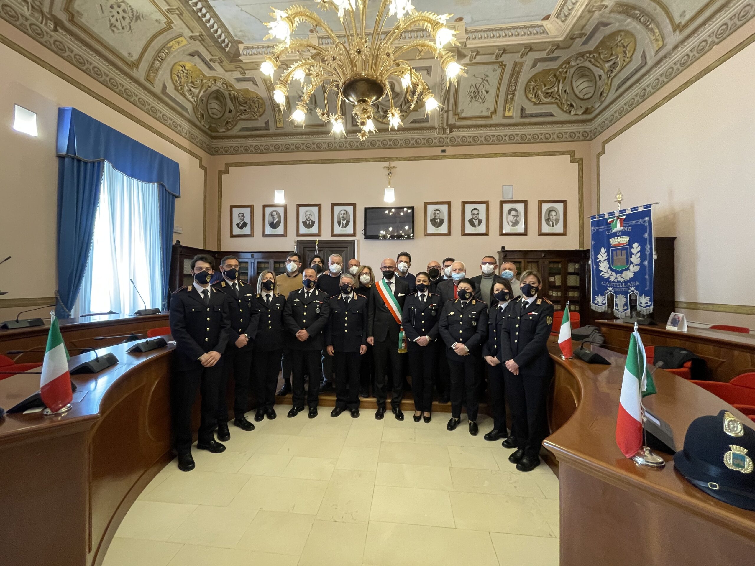*CASTELLANA GROTTE* – Si è svolta questa mattina, nell’Aula Consiliare del Palazzo Municipale di Castellana Grotte, la cerimonia di assegnazione dei gradi alle donne e agli uomini della Polizia Locale guidati dal comandante dott. Oronzo Cisternino. Una cerimonia attesa da circa 30 anni, ed oggi arrivata a seguito dell’approvazione da parte del Consiglio Comunale, a novembre scorso, di un atto regolamentare fondamentale e propedeutico: il Regolamento della Polizia Locale.