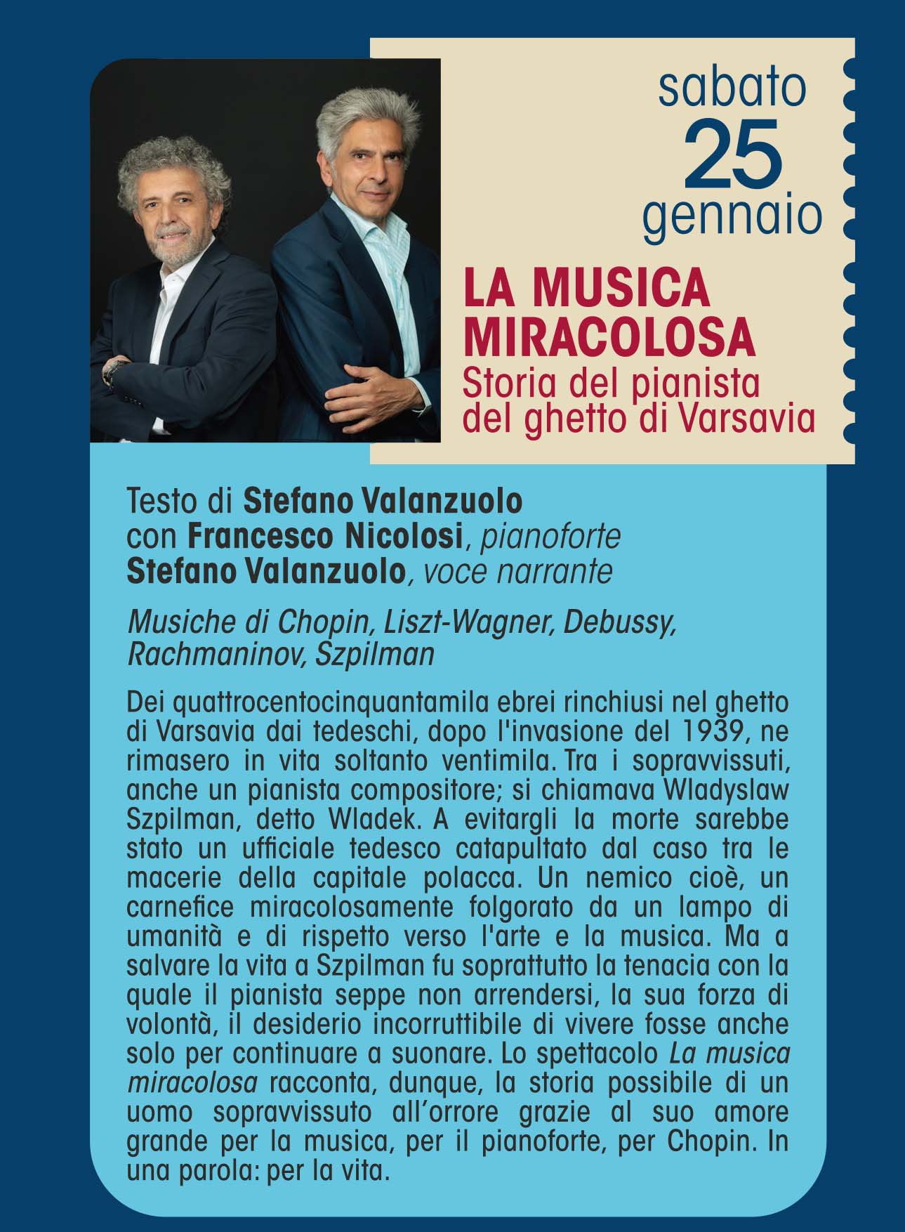 A inaugurare la stagione è stato lo spettacolo “La musica miracolosa. Storia del pianista del ghetto di Varsavia”, che ha raccontato la vicenda di Wladyslaw Szpilman, detto Wladek, un pianista e compositore polacco sopravvissuto all’orrore dell’Olocausto. La sua vita, conclusasi nel 2000, ha ispirato il celebre film *Il pianista* di Roman Polanski, vincitore della Palma d’Oro a Cannes e di tre Oscar a Los Angeles.
