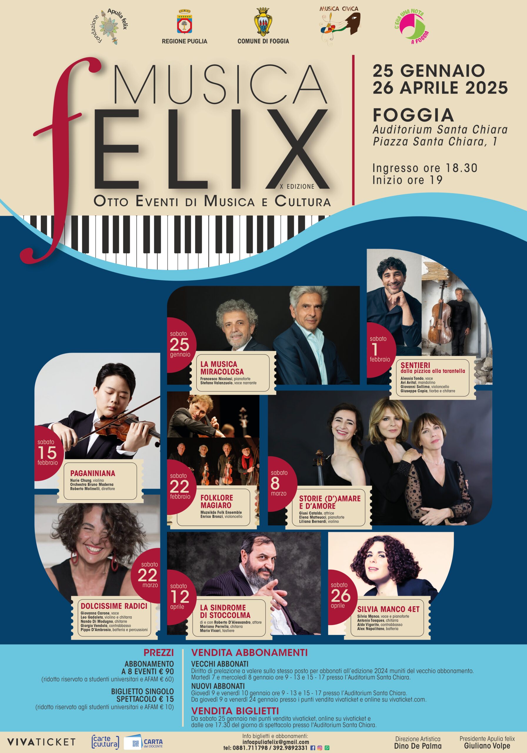 FOGGIA. Sabato 25 gennaio si è aperta la X edizione di Musica Felix, la seguitissima rassegna organizzata dalla Fondazione Apulia Felix, con la direzione artistica del musicista e organizzatore musicale Dino De Palma. Otto spettacoli sono stati inseriti in cartellone, dal 25 gennaio al 26 aprile, tutti programmati di sabato alle ore 19, presso l’Auditorium Santa Chiara di Foggia.
