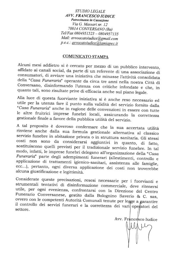 Considerate queste precisazioni, resesi necessarie per i fuorvianti e strumentali tentativi di disinformazione commerciale, deve ritenersi utile, per ogni evenienza, confrontarsi con la Direzione del Centro Funerario Conversanese, gestito dalla Bolognino Saverio 86 C. sas, ovvero con le competenti Autorita Comunali tenute per legge a garantire il controllo dei servizi funerari e la correttezza dei vari operatori del settore.
