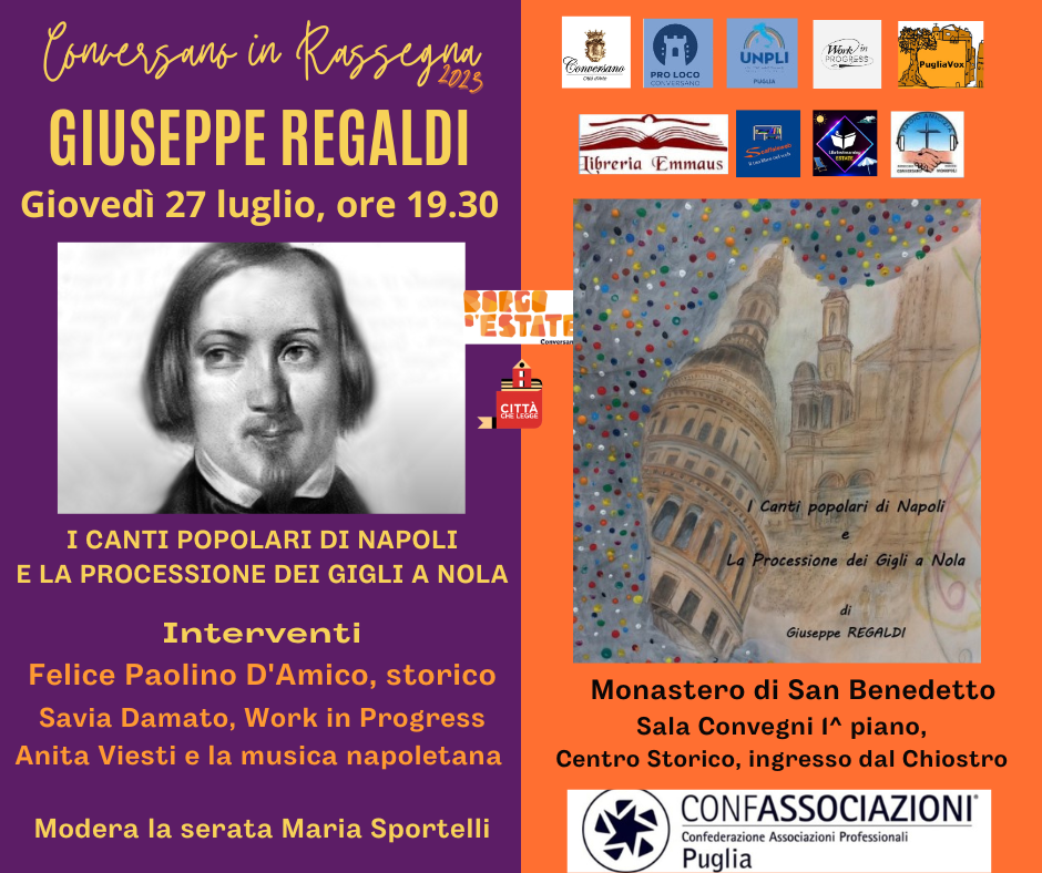 L’incontro che lo stesso REGALDI ha avuto con i vari artisti dell’epoca, cantanti, improvvisatori, venditori dei foglietti, tipografi e tanti altri gli hanno permesso di raccontarci come dalle canzoni napoletane, edite nei primi anni dell’800, si poteva trarre la storia dei nuovi costumi introdotti a Napoli, ovvero che ogni canzone veniva composta a seguito di un fatto accaduto, di un qualsiasi avvenimento che potesse dare sfogo all’immaginazione degli autori: la ferrovia che da Napoli conduceva a Caserta, la nuova lanterna al Molo – la flotta napoletana veleggiante per il Brasile – l’illuminazione a gas – lo splendido Caffè d’Europa. Durante il suo pellegrinare per l’Italia, il REGALDI ha soggiornato anche in Puglia: prima a Lecce dove trovò l’ambiente ottimale per le sue ispirazioni e compose alcune poesie (Le memorie della patria1 e Una notte nel mare Adriatico presso la scogliera di Tricase2 ), poi successivamente a Bari, Trani, Molfetta. Andria, Barletta, Terlizzi, Conversano, Monopoli e Noci. Secondo quando riportato dal Canonico Francesco Saverio ABBRESCIA3 , il nome di REGALDI “risonava benedetto tra gli evviva dell’intera Provincia”. Tutto quanto scritto da Giuseppe REGALDI evidenzia la forza del suo legame con la Puglia; non a caso, nella sua poesia “La Siccità delle Puglie”, pubblicata all’interno del libro “I Canti” (Napoli, 1847), definisce la Regione “La Bersabea d’Italia4 ”. Leggendo questa pubblicazione, i lettori potranno viaggiare indietro nel tempo e rivivere, anche se idealmente, la Napoli musicale dell’800 e la Festa dei Gigli del passato, con i suoi riti, la sua storia e l’antica tradizione. La copertina è tratta da una riproduzione di un disegno in acrilico e gessi raffigurante “Novara e Nola in festa” realizzato dall’artista novarese Pierangelo BERTOLO.