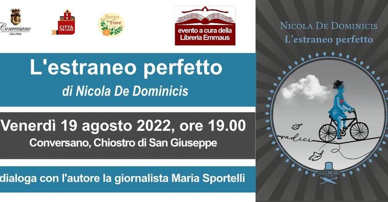 Conversano (Bari). Continuano gli appuntamenti di Letture nei Chiostri organizzati da Silvia Serena Perrone della libreria Emmaus con il patrocinio del comune di Conversano, assessorato alla Cultura. Venerdì 19 agosto 2022, ore 19.30, nel Chiostro di San Giuseppe (presso la biblioteca Maria Marangelli) appuntamento con il poeta e scrittore Nicola De Dominicis che presenta il suo ultimo lavoro editoriale “L’Estraneo Perfetto”, edito da Les Flaneurs edizioni. Dialogherà con l’autore la giornalista Maria Sportelli. L’evento è inserito nel contenitore culturale conversanese Borgo D’Estate. Ingresso libero. Info_3464201703.