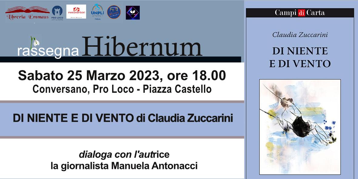 Conversano (Bari). La poesia è l’universo dell’anima che va accarezzata e alimentata attraverso l’ascolto e alla partecipazione di chi viaggia sulla parola poetica. Per questa ragione Sabato 25 marzo, ore 18.00 nella Sala G. Ramunni* *della Pro Loco, in Piazza Castello, non possiamo perdere le letture poetiche di Claudia Zuccarini che presenta la silloge: “Di Niente e di Vento” edito da Campi di Carta. Ospite della “Rassegna Hibernum” ideata e organizzata da Silvia Serena Perrone della Libreria Emmaus, dialogherà con l’autrice la giornalista Manuela Antonacci. L’evento è organizzato in collaborazione della Pro Loco, presidente Ninnì Galasso.