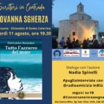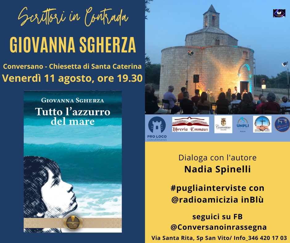 Conversano (Bari) – Venerdì 11 agosto appuntamento con Scrittori in Contrada, a Conversano presso la chiesetta di Santa Caterina, ore 19.30.  Protagonista questa volta è la storia d’amore e solidarietà di Giovanna Sgherza con il suo con il suo romanzo “Tutto l’azzurro del mare”, edito da Fides Edizioni. L’autrice, una professoressa di matematica con l’amore per le parole, è nata e vive a Molfetta dove il mare accarezza le sue coste. Con lo sguardo rivolto alle terre lontane la Sgherza pone sempre l’accento sul valore della solidarietà e dell’accoglienza. Il romanzo è un pensiero in movimento che abbraccia il senso della suo vivere con lo sguardo rivolto al mare…