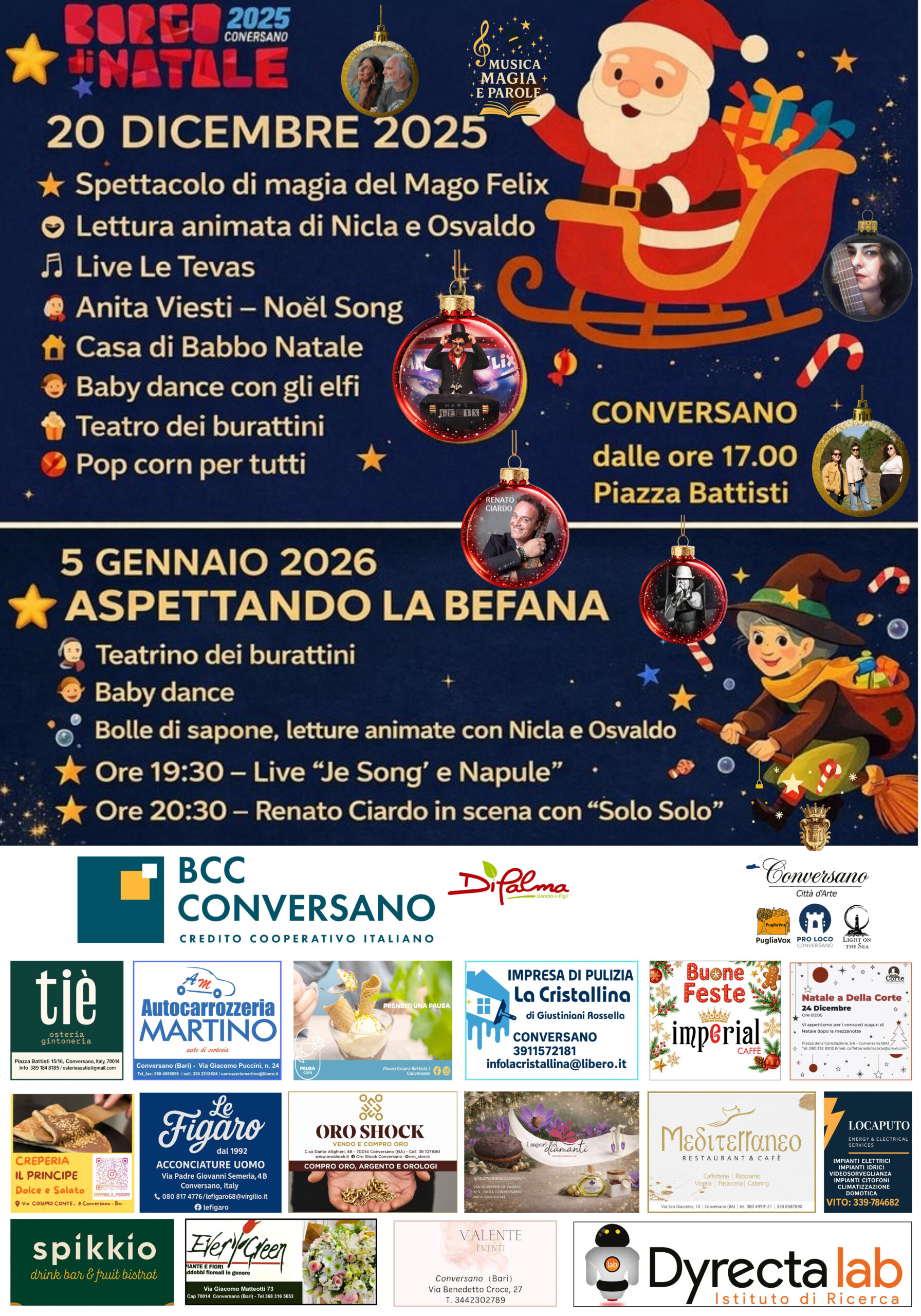 CONVERSANO, BORGO DI NATALE – Conversano si prepara a vivere un Natale di pura meraviglia con la seconda edizione di “Musica, Magia e Parole – C’era una Volta… I racconti di Natale”, in programma il 20 dicembre 2025 e il 5 gennaio 2026 in Piazza Battisti, ingresso libero.