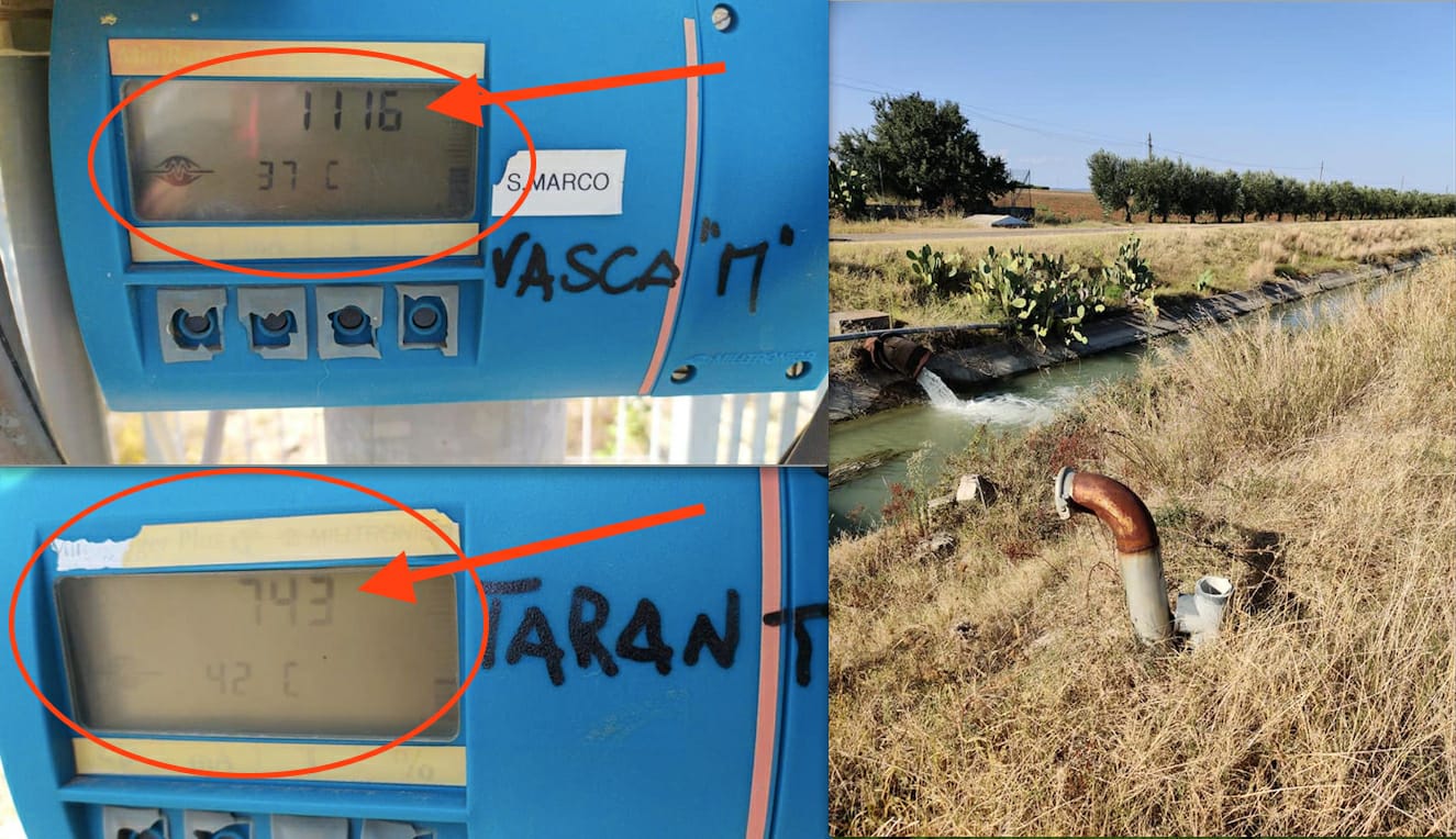 poiché verso i campi della Basilicata sono stati ‘dirottati’ 1116 litri d’acqua al secondo a fronte dei 743 distribuiti verso i campi del Tarantino”, hanno spiegato Rubino e De Padova mostrando le foto che documentano tale disparità di trattamento.