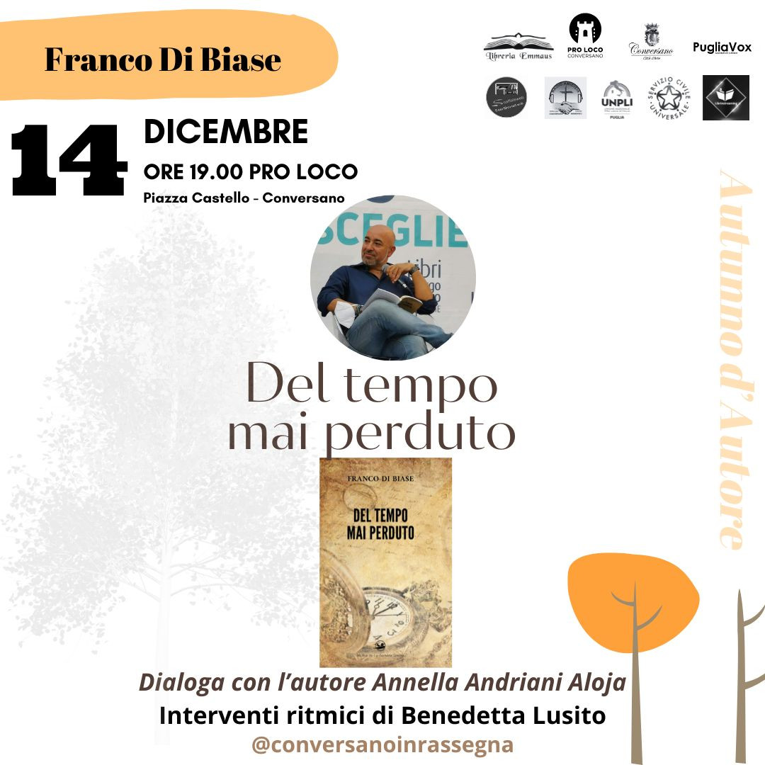 Conversano (Bari) – Nuovo appuntamento con la Rassegna Autunno d’Autore, Giovedì 14 dicembre, ore 19.00, presso la saletta G. Ramunni de la Pro Loco di Conversano. Ospite atteso il poeta Franco Di Biase presenta la silloge: “Del tempo mai perduto”, La Fontaine Edizioni, un prezioso e curatissimo contributo alla parola nella sua forma più alta e nella sua declinazione più dolce. Perché sia quando si scrive poesia che quando si ascolta il tempo non è mai perso. Dialoga con l’autore Annella Andriani Aloja, con interventi ritmici di Benedetta Lusito.