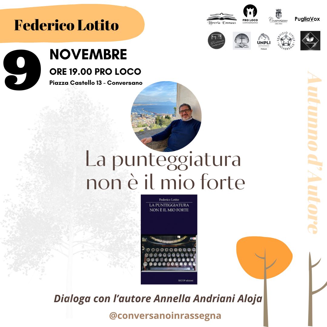 Conversano (Bari) – Continuano gli appuntamenti letterari a Conversano con la Rassegna Autunno d’Autore. Giovedì 9 Novembre, ore 19.00, nella sede della Pro Loco (Piazza Castello), Federico Lotito presenta “La punteggiatura non è il mio forte”, SECOP edizioni Corato. Modera la serata Annella Andriani Aloja. Info_3464201703, ingresso libero.