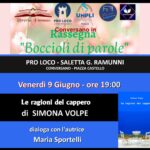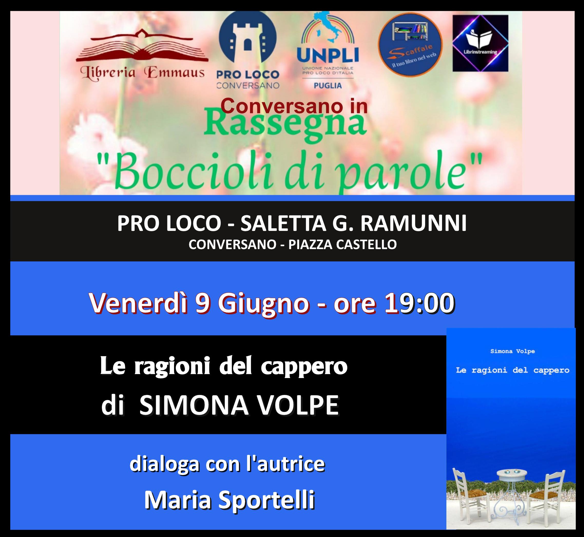 Conversano (Bari) – Boccioli di Parole è il nuovo spazio culturale dedicato agli autori del territorio pugliese: scrittori, poeti e narratori uniti dall’amore per le parole che si “aprono” al lettore come piccoli boccioli. L’evento è inserito nel contenitore *Conversano in Rassegna*, pensato, ideato e organizzato da *Silvia Serena Perrone* della Libreria Emmaus in collaborazione con Ninnì Galasso presidente della Pro Loco, Francesco Rizzo di Scaffaeleweb, Tony Vinci di Librinstreaming e la giornalista *Maria Sportelli* con #puglianterviste. Gli appuntamenti si svolgeranno nella saletta G. Ramunni della Pro Loco e presso la sala convegni del Monastero di San Benedetto, (1^ Piano, ingresso dal chiostro), ingresso libero.Ingresso libero, per info segui la pagina facebook @Conversanoinrassegna, libreriaemmaus, 346 420 1703. LE RAGIONI DEL CAPPERO, SIMONA VOLPE Venerdì 9 giugno, ore 19:00, Pro Loco – Saletta G. Ramunni, in piazza Castello. Simona Volpe presenta la raccolta poetica: “Le ragioni del Cappero”, Bertoni editore. Dialoga con l’autrice la giornalista Maria Sportelli.*