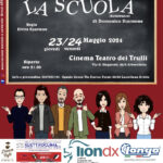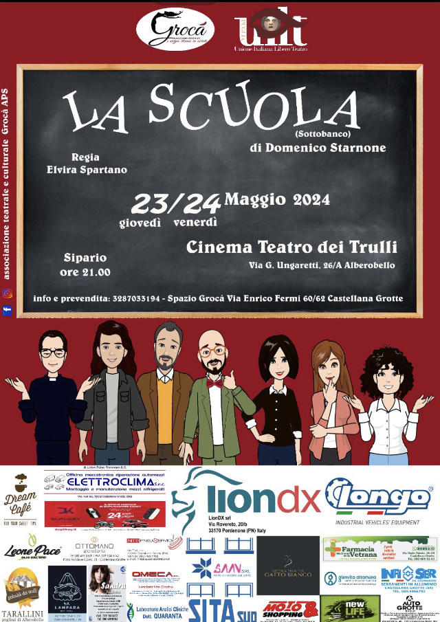 ALBEROBELLO – L’Associazione Teatrale “GROCÀ” APS, dopo la recente trasferta a Roma, per portare nella capitale “Abbatissae. Donne potere e altre storie”, la rievocazione itinerante andata in scena l’estate scorsa nel centro storico della città delle grotte, racchiusa nel cortometraggio, risultato vincitore del Concorso “Voci dal territorio”, torna in scenacon un altro sogno: “LA SCUOLA” (Sottobanco) di Domenico Starnone, che debutterà giovedì 23 e venerdì 24 maggio 2024, sipario alle ore 21.00, presso il Cine Teatro dei TRULLI di Alberobello.