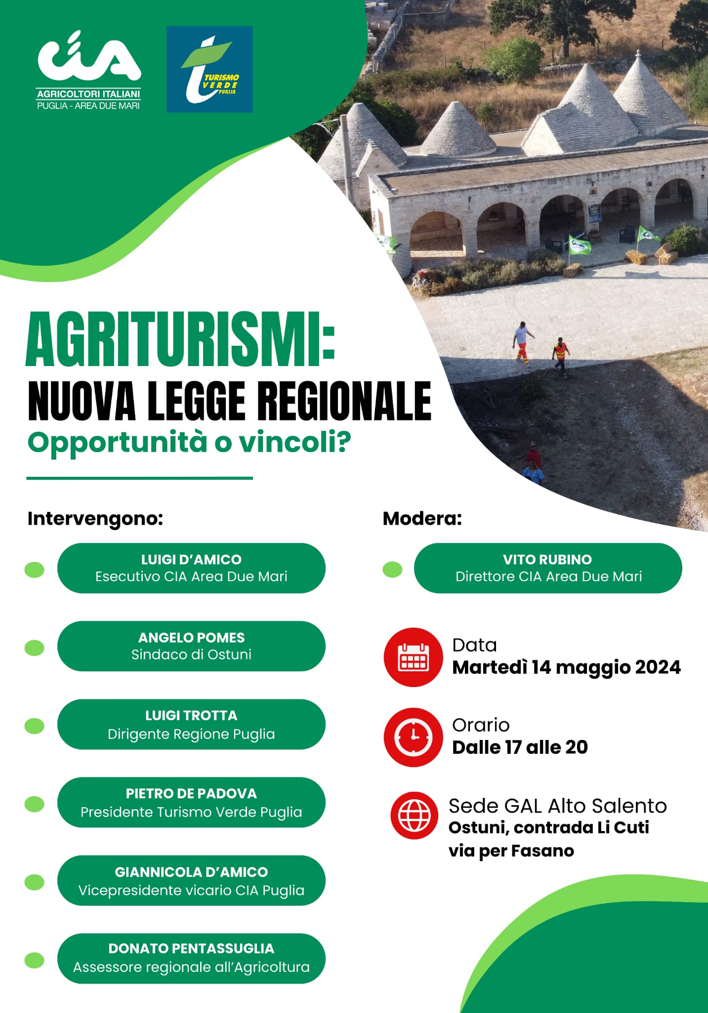 L’iniziativa, intitolata “Agriturismi, la nuova legge regionale: opportunità o vincoli?”, è organizzata da CIA Agricoltori Italiani Puglia Area Due Mari e dall’associazione Turismo Verde Puglia, prende il via alle ore 17:00 e prosegue fino alle ore 20:00.