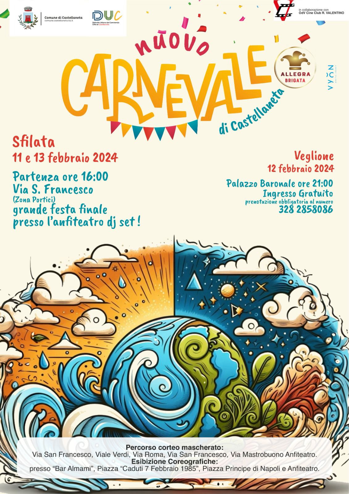 Il Carnevale di Castellaneta si svolgerà in tre giornate, le sfilate mascherate nei giorni di domenica 11 e martedì 13 febbraio 2024, a partire dalle ore 16:00, e Il Veglione di Carnevale che si terrà lunedì 12 febbraio 2024, alle ore 21:00, presso Palazzo Baronale di Castellaneta.