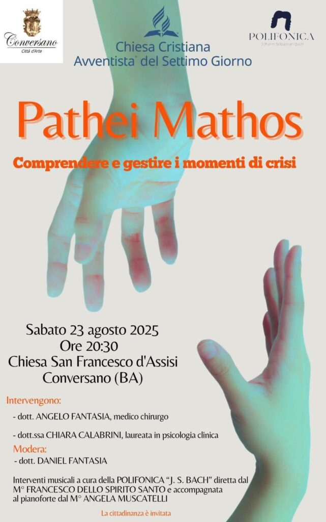 Sabato 23 agosto prossimo, alle ore 20:30, presso la chiesa di San Francesco d’Assisi a Conversano si terrà la conferenza PATHEI MATHOS, comprendere e gestire i momenti di cristi. L’evento è organizzato dalla Chiesa Cristiana Avventista del Settimo Giorno di Conversano ed è patrocinato dalla Città di Conversano. L’interessante e sempre attuale tema della crisi e la sua gestione sarà affrontato dal dottor Angelo Fantasia, medico chirurgo, e della dott.ssa Chiara Calabrini, laureata in psicologia clinica. I momenti saranno intervallati da brani musicali eseguiti dalla Polifonica “J. S. Bach” di Conversano diretta dal M° Francesco Dello Spirito Santo e accompagnata all’organo dal M° Angela Muscatelli. L’evento sarà libero e gratuito e tutta la cittadinanza è invitata a prendervi parte.