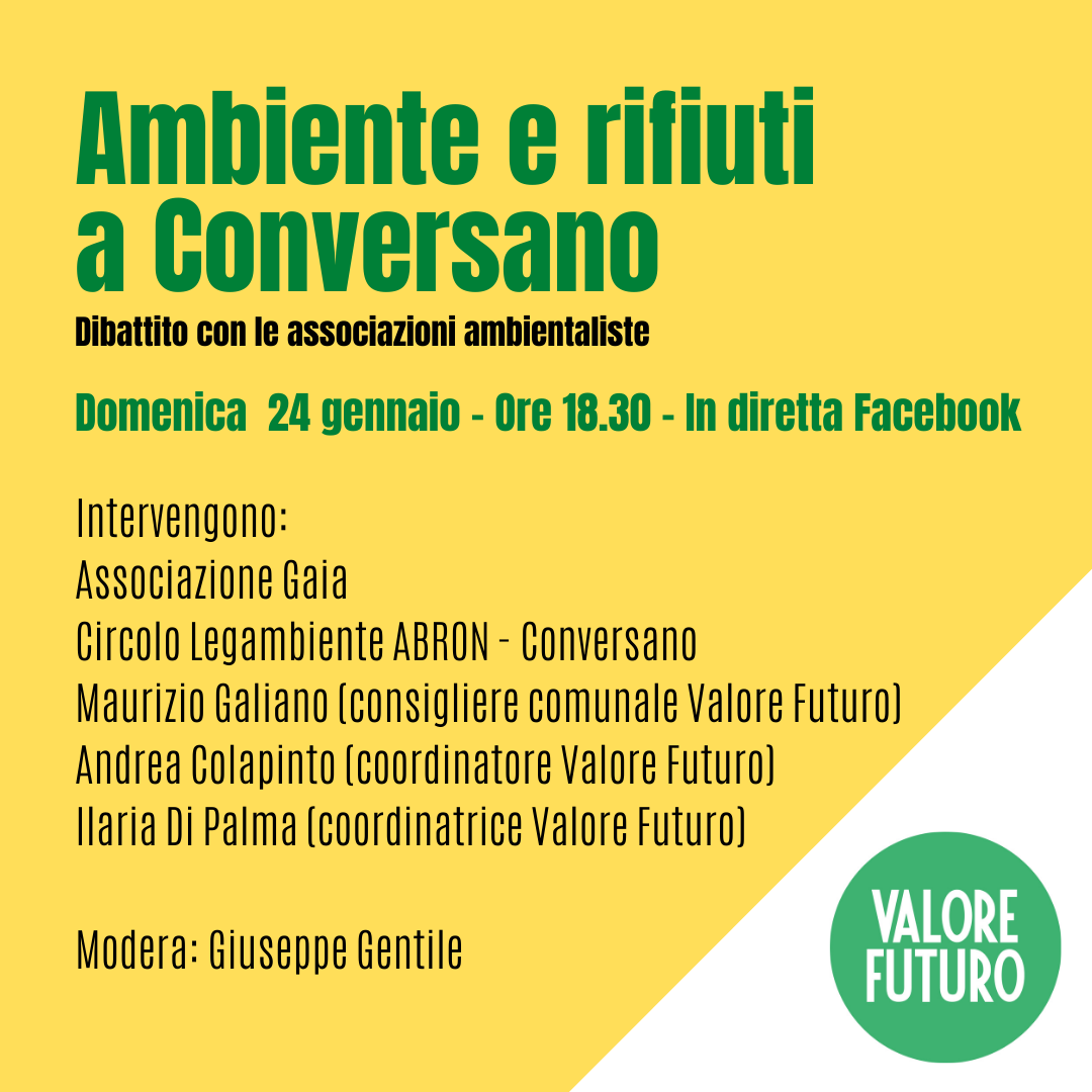 Questi sono solo alcuni dei temi che Valore Futuro vuole affrontare nel dibattito che sarà trasmesso in diretta Facebook dalla pagina del movimento (https://www.facebook.com/valorefuturoconversano) domenica 24 gennaio alle ore 18.30.