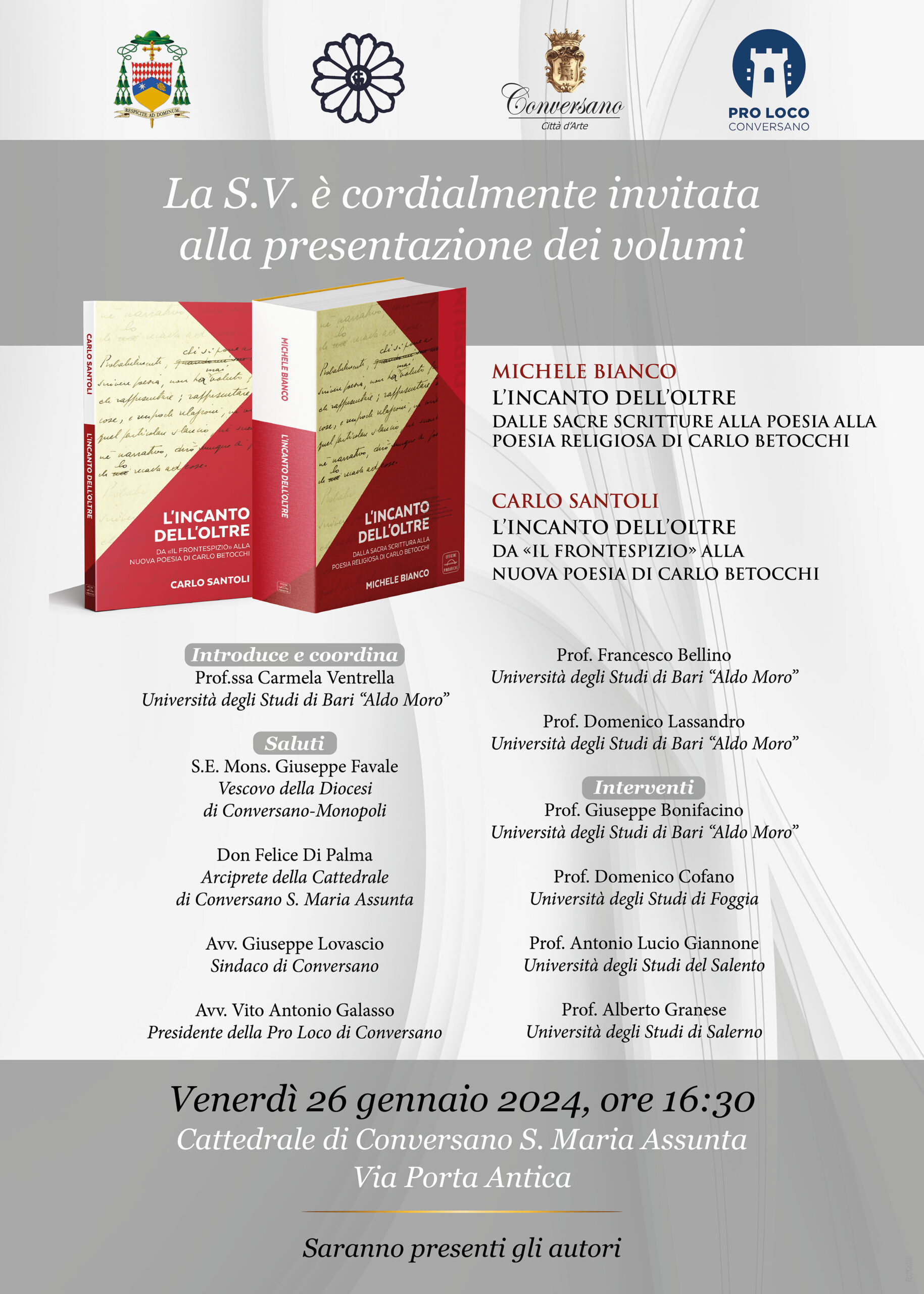 Nella splendida cornice della Cattedrale di Conversano S. Maria Assunta, si terrà, in data venerdì 26 gennaio 2024, la presentazione dei volumi di Michele Bianco e Carlo Santoli: “L’incanto dell’oltre: dalle sacre scritture alla poesia religiosa di Carlo Betocchi” e “L’incanto dell’oltre: da il ‘frontespizio’ alla nuova poesia di Carlo Betocchi”.