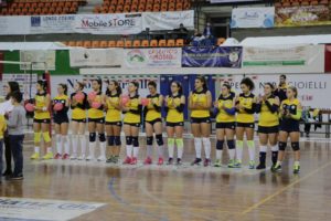 La formazione messa in campo da mister Giuseppe Mangini, fà subito capire l’andamento della partita, chiudendo il primo set 25 a 10 e il secondo 25 a 20. Ma nel terzo set, ritorna l’incubo, in vantaggio di quasi 6 punti, si fa agguantare e superare perdendo il set per 24 a 26, nel quarto set, il calo di concentrazione viene subito cancellato e la formazione giallo blu, chiude il terzo set per 25 a 17.